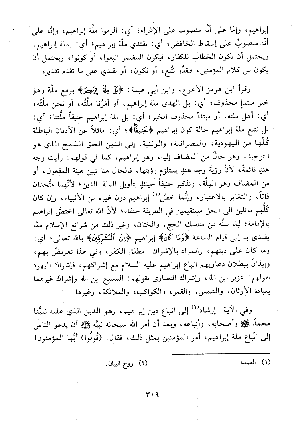 إبراهيم، وإمّا على أنَّه منصوب على الإغراء؛ أي؛ الزموا ملَّة إبراهيم، وإمَّا على أنّه منصوبٌ على إسقاط الخافض؛ أي: نقتدي ملّة إبراهيم؛ أي: بملة إبراهيم، ويحتمل أن يكون الخطاب للكفار، فيكون المضمر اتبعوا، أو كونوا، ويحتمل أن يكون من كلام المؤمنين، فيقدَّر نتَّبع، أو نكون، أو نقتدي على ما تقدم تقديره.