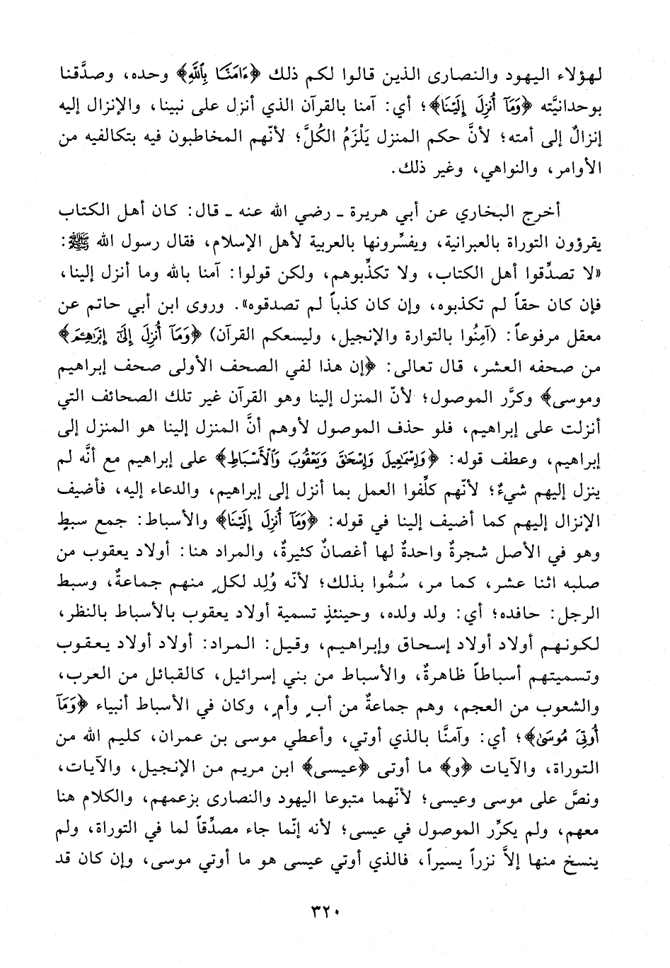 أخرج البخاري عن أبي هريرة - رضي الله عنه - قال: كان أهل الكتاب يقرؤون التوراة بالعبرانية، ويفسِّرونها بالعربية لأهل الإِسلام، فقال رسول الله - صلى الله عليه وسلم -: "لا تصدِّقوا أهل الكتاب، ولا تكذِّبوهم، ولكن قولوا: آمنا باللهِ وما أنزل إلينا، فإن كان حقًّا لم تكذبوه، وإن كان كذبًا لم تصدقوه". وروى ابن أبي حاتم عن معقل مرفوعًا: (آمِنُوا بالتوارة والإنجيل، وليسعكم القرآن) {وَمَا أُنْزِلَ إِلَى إِبْرَاهِيمَ} من صحفه العشر، قال تعالى: {إن هذا لفي الصحف الأولى صحف إبراهيم وموسى} وكرَّر الموصول؛ لأنّ المنزل إلينا وهو القرآن غير تلك الصحائف التي أنزلت على إبراهيم، فلو حذف الموصول لأوهم أنَّ المنزل إلينا هو المنزل إلى إبراهيم، وعطف قوله: {وَإِسْمَاعِيلَ وَإِسْحَاقَ وَيَعْقُوبَ وَالْأَسْبَاطِ} على إبراهيم مع أنَّه لم ينزل إليهم شيءٌ؛ لأنّهم كلِّفوا العمل بما أنزل إلى إبراهيم، والدعاء إليه، فأضيف الإنزال إليهم كما أضيف إلينا في قوله: {وَمَا أُنْزِلَ إِلَيْنَا} والأسباط: جمع سبطٍ وهو في الأصل شجرةٌ واحدةٌ لها أغصانٌ كثيرةٌ، والمراد هنا: أولاد يعقوب من صلبه اثنا عشر، كما مر، سُمُّوا بذلك؛ لأنّه وُلد لكلٍ منهم جماعةٌ، وسبط الرجل: حافده؛ أي: ولد ولده، وحينئذٍ تسمية أولاد يعقوب بالأسباط بالنظر، لكونهم أولاد أولاد إسحاق وإبراهيم، وقيل: المراد: أولاد أولاد يعقوب وتسميتهم أسباطًا ظاهرةٌ، والأسباط من بني إسرائيل، كالقبائل من العرب، والشعوب من العجم، وهم جماعةٌ من أبٍ وأمٍ، وكان في الأسباط أنبياء {وَمَا أُوتِيَ مُوسَى}؛ أي: وآمنَّا بالذي أوتي، وأعطي موسى بن عمران، كليم الله من التوراة، والآيات {و} ما أوتى {عيسى} ابن مريم من الإنجيل، والآيات، ونصَّ على موسى وعيسى؛ لأنّهما متبوعا اليهود والنصارى بزعمهم، والكلام هنا معهم، ولم يكرِّر الموصول في عيسى؛ لأنه إنّما جاء مصدِّقًا لما في التوراة، ولم ينسخ منها إلّا نزرًا يسيرًا، فالذي أوتي عيسى هو ما أوتي موسى، وإن كان قد