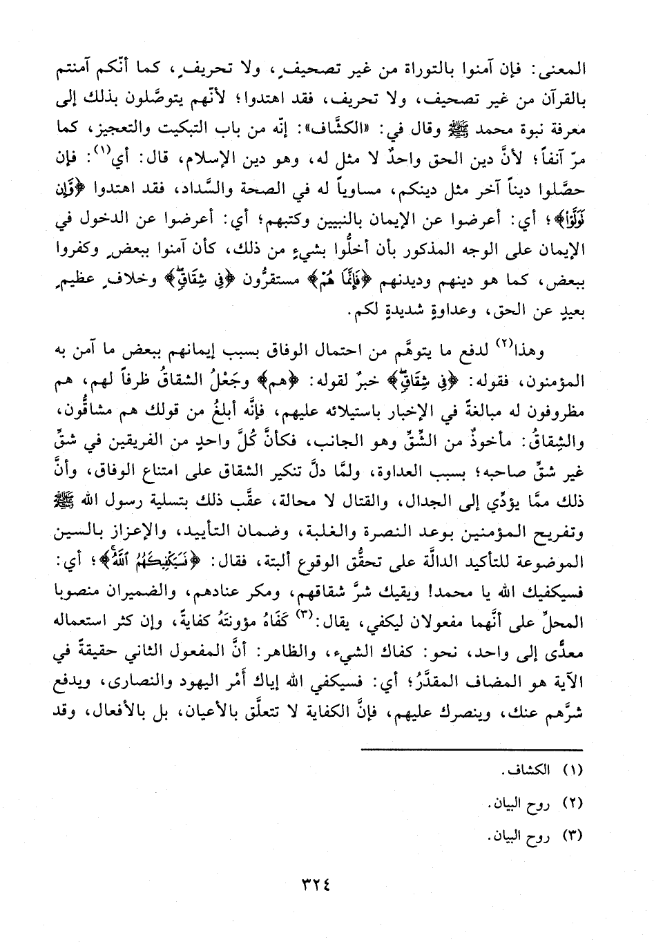 وهذا (¬2) لدفع ما يتوهَّم من احتمال الوفاق بسبب إيمانهم ببعض ما آمن به المؤمنون، فقوله: {فِي شِقَاقٍ} خبرٌ لقوله: {هم} وجَعْلُ الشقاق ظرفًا لهم، هم مظروفون له مبالغةً في الإخبار باستيلائه عليهم، فإنَّه أبلغُ من قولك هم مشاقُّون، والشِقاقُ: مأخوذٌ من الشِّقِّ وهو الجانب، فكأنَّ كُلَّ واحدٍ من الفريقين في شقٍّ غير شقِّ صاحبه؛ بسبب العداوة، ولمَّا دلَّ تنكير الشقاق على امتناع الوفاق، وأنَّ ذلك ممَّا يؤدِّي إلى الجدال، والقتال لا محالة، عقَّب ذلك بتسلية رسول الله - صلى الله عليه وسلم - وتفريح المؤمنين بوعد النصرة والغلبة، وضمان التأييد، والإعزاز بالسين الموضوعة للتأكيد الدالَّة على تحقُّق الوقوع ألبتة، فقال: {فَسَيَكْفِيكَهُمُ اللَّهُ}؛ أي: فسيكفيك الله يا محمد! ويقيك شرَّ شقاقهم، ومكر عنادهم، والضميران منصوبا المحلِّ على أنَّهما مفعولان ليكفي، يقال: (¬3) كَفَاهُ مؤونتَهُ كفايةً، وإن كثر استعماله معدًّى إلى واحد، نحو: كفاك الشيء، والظاهر: أنَّ المفعول الثاني حقيقةً في الآية هو المضاف المقدَّرُ؛ أي: فسيكفي الله إياك أَمْر اليهود والنصارى، ويدفع شرَّهم عنك، وينصرك عليهم، فإنَّ الكفاية لا تتعلَّق بالأعيان، بل بالأفعال، وقد