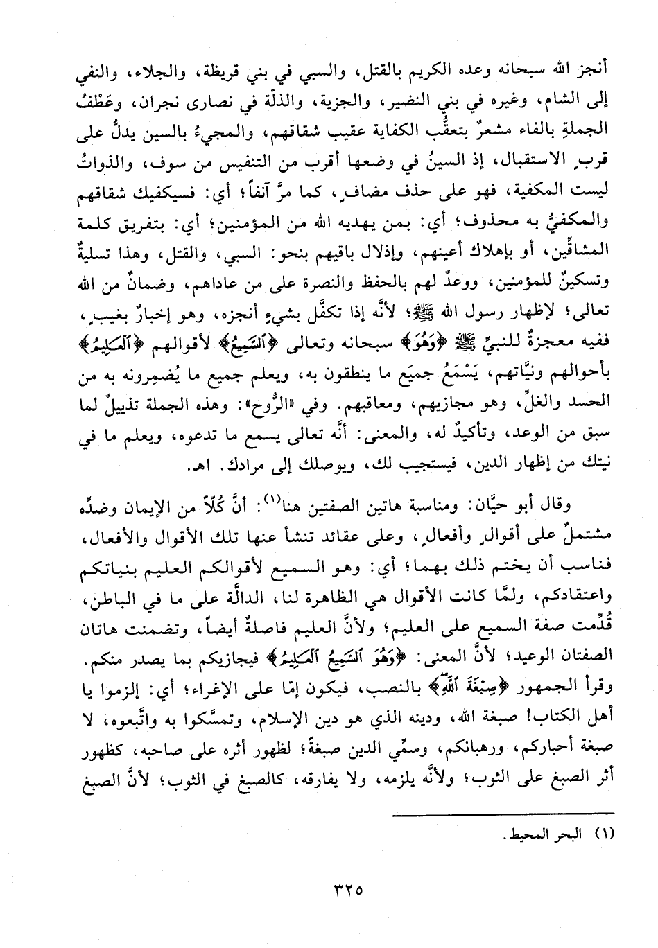 138 - وقرأ الجمهور {صِبْغَةَ اللَّهِ} بالنصب، فيكون إمّا على الإغراء؛ أي: إلزموا يا أهل الكتاب! صبغة الله، ودينه الذي هو دين الإِسلام، وتمسَّكوا به واتَّبعوه، لا صبغة أحباركم، ورهبانكم، وسمِّي الدين صبغةً؛ لظهور أثره على صاحبه، كظهور أثر الصبغ على الثوب؛ ولأنَّه يلزمه، ولا يفارقه، كالصبغ في الثوب؛ لأنَّ الصبغ