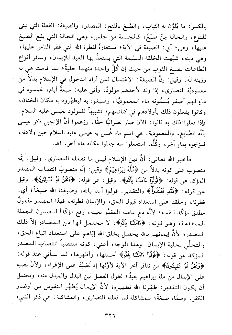 فأخبر الله تعالى: أنَّ دين الإِسلام ليس ما تفعله النصارى. وقيل: إنّه منصوب على كونه بدلًا من {مِلَّةَ إِبْرَاهِيمَ} وقيل: إنّه منصوبٌ انتصاب المصدر المؤكد عن قوله: {قُولُوا آمَنَّا بِاللَّهِ}. وقيل: عن قوله: {وَنَحْنُ لَهُ مُسْلِمُونَ}. وقيل عن قوله: {فَقَدِ اهْتَدَوْا} والتقدير: قولوا آمنا بالله، وصبغنا الله صبغةً؛ أي: فطرنا، وخلقنا على استعداد قبول الحق، والإيمان فطرته، فهذا المصدر مفعولٌ مطلق مؤكِّد لنفسه؛ لأنَّه مع عامله المقدَّر بعينه، وقع مؤكّدًا لمضمون الجملة المتقدمة، وهو قوله: {آمَنَّا بِاللَّهِ}، لا محتمل لها من المصادر إلّا ذلك المصدر؛ لأنَّ إيمانهم بالله يحصل بخلق الله إيّاهم على استعداد اتباع الحق، والتحلِّي بحلية الإيمان. وهذا الوجه؛ أعني: كونه منتصبًا انتصاب المصدر المؤكد عن قوله: {قُولُوا آمَنَّا بِاللَّهِ} أحسنها، وأظهرها، لما سيأتي عند قوله: {وَنَحْنُ لَهُ عَابِدُونَ} من تنافر آخر الآية لأوَّلها إذ نَصَبْنَا على الإغراء، ولأنَّ نصبه على الإبدال من ملة إبراهيم بعيدٌ؛ لطول الفصل بين البدل والمبدل منه، ويحتمل أن يكون التقدير: طهَّرنا الله تطهيره؛ لأنَّ الإيمان يُطهِّر النفوس من أوضار الكفر، وسمَّاه صبغةً؛ للمشاكلة لما فعلته النصارى، والمشاكلة: هي ذكر الشيء