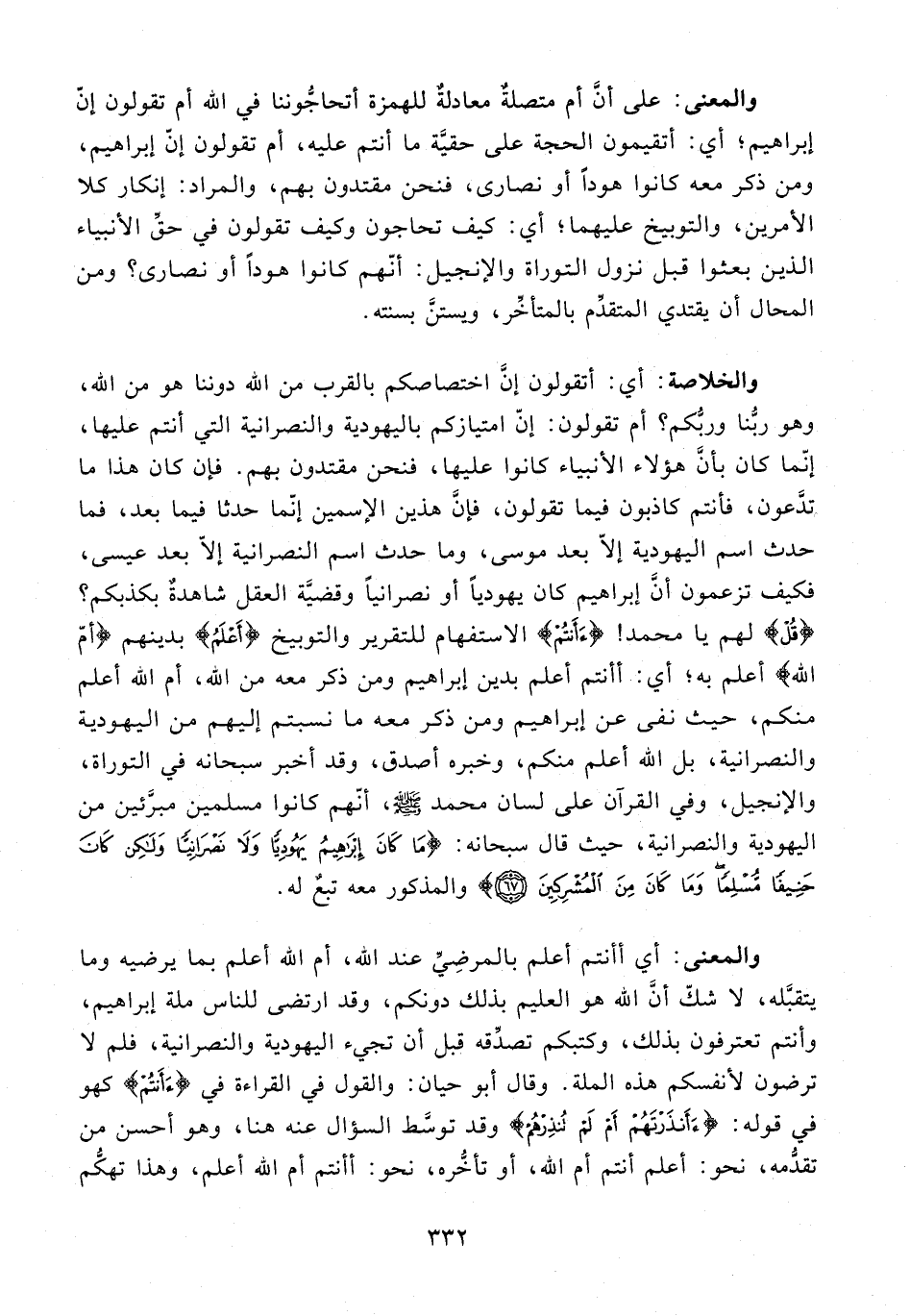 والخلاصة: أي: أتقولون إنَّ اختصاصكم بالقرب من الله دوننا هو من الله، وهو ربُّنا وربُّكم؟ أم تقولون: إنّ امتيازكم باليهودية والنصرانية التي أنتم عليها، إنّما كان بأنَّ هؤلاء الأنبياء كانوا عليها، فنحن مقتدون بهم. فإن كان هذا ما تدَّعون، فأنتم كاذبون فيما تقولون، فإنَّ هذين الإسمين إنّما حدثا فيما بعد، فما حدث اسم اليهودية إلّا بعد موسى، وما حدث اسم النصرانية إلّا بعد عيسى، فكيف تزعمون أنَّ إبراهيم كان يهوديًّا أو نصرانيًّا وقضيَّة العقل شاهدةٌ بكذبكم؟ {قُلْ} لهم يا محمد! {أَأَنْتُمْ} الاستفهام للتقرير والتوبيخ {أَعْلَمُ} بدينهم {أَمِ اللَّهُ} أعلم به؛ أي: أأنتم أعلم بدين إبراهيم ومن ذكر معه من الله، أم الله أعلم منكم، حيث نفى عن إبراهيم ومن ذكر معه ما نسبتم إليهم من اليهودية والنصرانية، بل الله أعلم منكم، وخبره أصدق، وقد أخبر سبحانه في التوراة، والإنجيل، وفي القرآن على لسان محمد - صلى الله عليه وسلم -، أنّهم كانوا مسلمين مبرَّئين من اليهودية والنصرانية، حيث قال سبحانه: {مَا كَانَ إِبْرَاهِيمُ يَهُودِيًّا وَلَا نَصْرَانِيًّا وَلَكِنْ كَانَ حَنِيفًا مُسْلِمًا وَمَا كَانَ مِنَ الْمُشْرِكِينَ (67)} والمذكور معه تبعٌ.