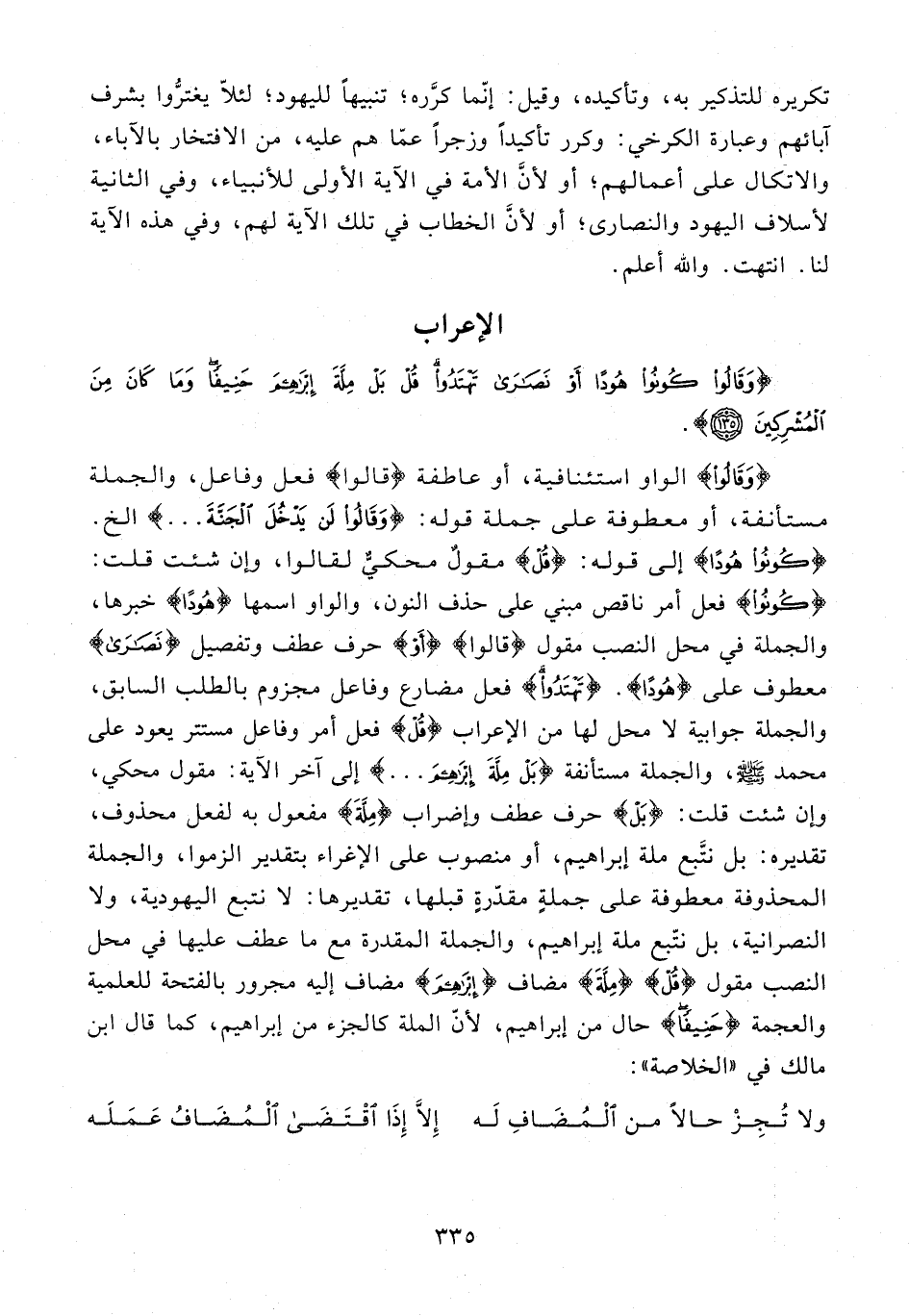 {وَقَالُوا} الواو استئنافية، أو عاطفة {قالوا} فعل وفاعل، والجملة مستأنفة، أو معطوفة على جملة قوله: {وَقَالُوا لَنْ يَدْخُلَ الْجَنَّةَ ...} هو الخ. {كُونُوا هُودًا} إلى قوله: {قُلْ} مقولٌ محكيٌّ لقالوا، وإن شئت قلت: {كُونُوا} فعل أمر ناقص مبني على حذف النون، والواو اسمها {هُودًا} خبرها، والجملة في محل النصب مقول {قَالُوا} {أَوْ} حرف عطف وتفصيل {نَصَارَى} معطوف على {هُودًا}. {تَهْتَدُوا} فعل مضارع وفاعل مجزوم بالطلب السابق، والجملة جوابية لا محل لها من الإعراب {قُلْ} فعل أمر وفاعل مستتر يعود على محمد - صلى الله عليه وسلم -، والجملة مستأنفة {بَلْ مِلَّةَ إِبْرَاهِيمَ ...} إلى آخر الآية: مقول محكي، وإن شئت قلت: {بَلْ} حرف عطف وإضراب {مِلَّةَ} مفعول به لفعل محذوف، تقديره: بل نتَّبع ملة إبراهيم، أو منصوب على الإغراء بتقدير الزموا، والجملة المحذوفة معطوفة على جملةٍ مقدّرةٍ قبلها، تقديرها: لا نتبع اليهودية، ولا النصرانية، بل نتّبع ملة إبراهيم، والجملة المقدرة مع ما عطف عليها في محل النصب مقول {قُلْ} {مِلَّةَ} مضاف {إِبْرَاهِيمَ} مضاف إليه مجرور بالفتحة للعلمية والعجمة {حَنِيفًا} حال من إبراهيم؛ لأنّ الملة كالجزء من إبراهيم، كما قال ابن مالك في "الخلاصة":
