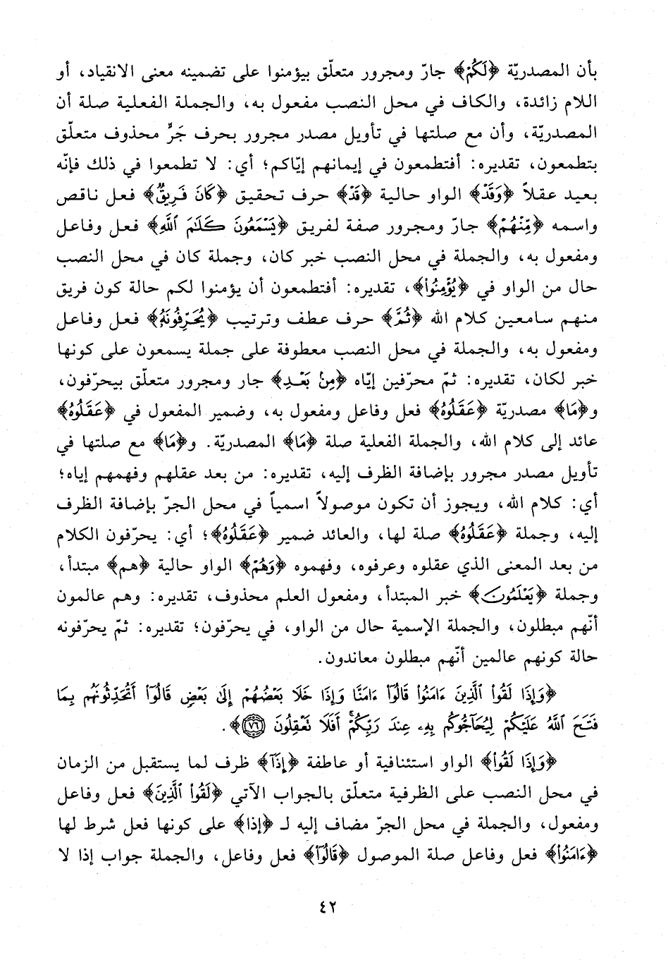 بأن المصدريّة {لَكُمْ} جاز ومجرور متعلّق بيؤمنوا على تضمينه معنى الانقياد، أو اللام زائدة، والكاف في محل النصب مفعول به، والجملة الفعلية صلة أن المصدريّة، وأن مع صلتها في تأويل مصدر مجرور بحرف جَرٍّ محذوف متعلّق يتطمعون، تقديره: أفتطمعون في إيمانهم إيّاكم؛ أي: لا تطمعوا في ذلك فإنّه بعيد عقلًا {وَقَدْ} الواو حالية {قَدْ} حرف تحقيق {كَانَ فَرِيقٌ} فعل ناقص واسمه {مِنهُمْ} وجارّ ومجرور صفة لفريق {يَسْمَعُونَ كَلَامَ اللَّهِ} فعل وفاعل ومفعول به، والجملة في محل النصب خبر كان، وجملة كان في محل النصب حال من الواو في {يُؤْمِنُوا}، تقديره: أفتطمعون أن يؤمنوا لكم حالة كون فريق منهم سامعين كلام الله {ثُمَّ} حرف عطف وترتيب {يُحَرِّفُونَهُ} فعل وفاعل ومفعول به، والجملة في محل النصب معطوفة على جملة يسمعون على كونها خبر لكان، تقديره: ثمّ محرّفين إيّاه {مِنْ بَعْدِ} جار ومجرور متعلّق بيحرّفون، و {مَا} مصدريّة {عَقَلُوهُ} فعل وفاعل ومفعول به، وضمير المفعول في {عَقَلُوهُ} عائد إلى كلام الله، والجملة الفعلية صلة {مَا} المصدريّة. و {مَا} مع صلتها في تأويل مصدر مجرور بإضافة الظرف إليه، تقديره: من بعد عقلهم وفهمهم إياه؛ أي: كلام الله، ويجوز أن تكون موصولًا اسميًّا في محل الجرّ بإضافة الظرف إليه، وجملة {عَقَلُوهُ} صلة لها، والعائد ضمير {عَقَلُوهُ}؛ أي: يحرّفون الكلام من بعد المعنى الذي عقلوه وعرفوه، وفهموه {وَهُمْ} الواو حالية {هم} مبتدأ، وجملة {يَعْلَمُونَ} خبر المبتدأ، ومفعول العلم محذوف، تقديره: وهم عالمون أنّهم مبطلون، والجملة الإسمية حال من الواو، في يحرّفون؛ تقديره: ثمّ يحرّفونه حالة كونهم عالمين أنّهم مبطلون معاندون.