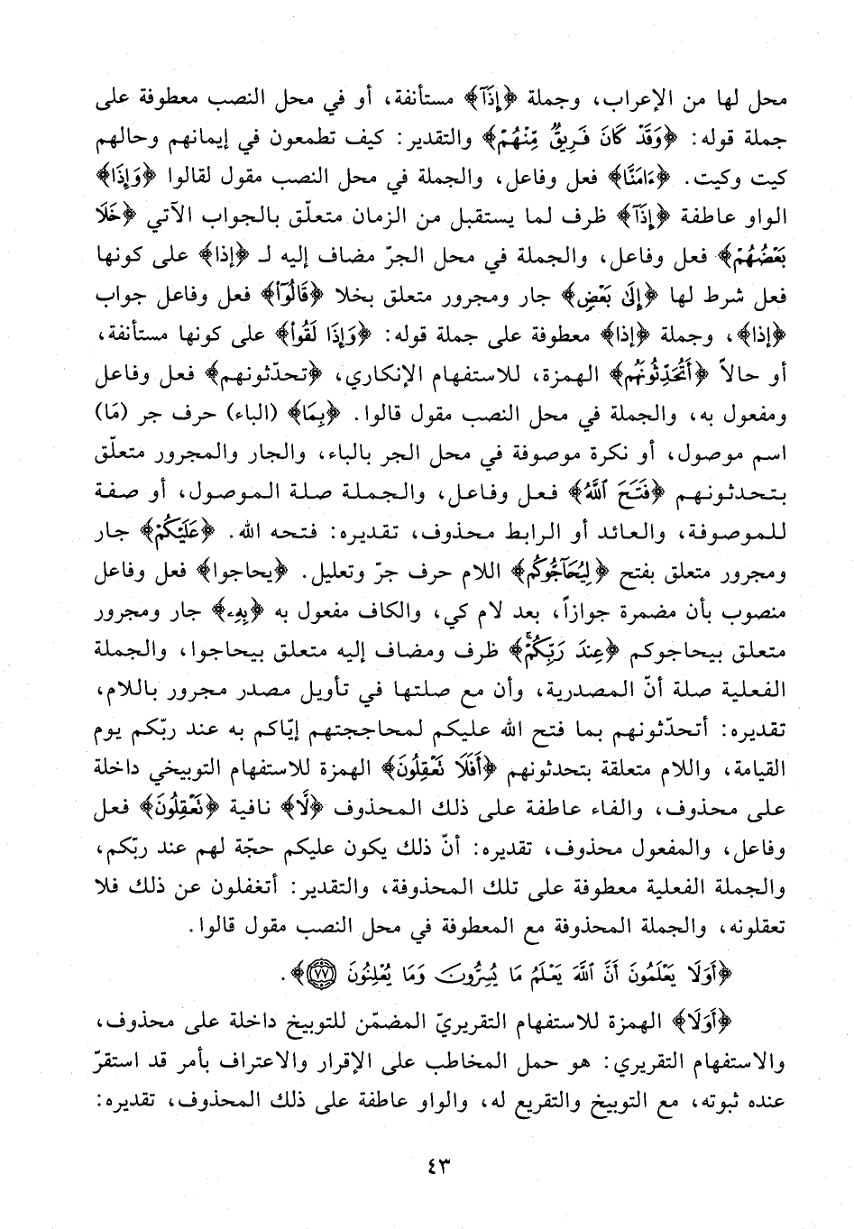 محل لها من الإعراب، وجملة {إِذَا} مستأنفة، أو في محل النصب معطوفة على جملة قوله: {وَقَدْ كَانَ فَرِيقٌ مِنْهُمْ} والتقدير: كيف تطمعون في إيمانهم وحالهم كيت وكيت. {آمَنَّا} فعل وفاعل، والجملة في محل النصب مقول لقالوا {وَإِذَا} الواو عاطفة {إِذَا} ظرف لما يستقبل من الزمان متعلّق بالجواب الآتي {خَلَا بَعْضُهُمْ} فعل وفاعل، والجملة في محل الجرّ مضاف إليه لـ {إذا} على كونها فعل شرط لها {إِلَى بَعْضٍ} جار ومجرور متعلق بخلا {قَالُوا} فعل وفاعل جواب {إذا}، وجملة {إذا} معطوفة على جملة قوله: {وَإِذَا لَقُوا} على كونها مستأنفة، أو حالًا {أَتُحَدِّثُونَهُمْ} الهمزة، للاستفهام الإنكاري، {تُحَدِّثُونَهُمْ} فعل وفاعل ومفعول به، والجملة في محل النصب مقول قالوا. {بِمَا} (الباء) حرف جر {مَا} اسم موصول، أو نكرة موصوفة في محل الجر بالباء، والجار والمجرور متعلّق بتحدثونهم {فَتَحَ اللَّهُ} فعل وفاعل، والجملة صلة الموصول، أو صفة للموصوفة، والعائد أو الرابط محذوف، تقديره: فتحه الله. {عَلَيْكُمْ} جار ومجرور متعلق بفتح {لِيُحَاجُّوكُمْ} اللام حرف جرّ وتعليل. {يحاجوا} فعل وفاعل منصوب بأن مضمرة جوازًا، بعد لام كي، والكاف مفعول به {بِهِ} جار ومجرور متعلق بيحاجوكم {عِنْدَ رَبِّكُمْ} ظرف ومضاف إليه متعلق بيحاجوا، والجملة الفعلية صلة أنّ المصدرية، وأن مع صلتها في تأويل مصدر مجرور باللام، تقديره: أتحدّثونهم بما فتح الله عليكم لمحاججتهم إيّاكم به عند ربّكم يوم القيامة، واللام متعلقة بتحدثونهم {أَفَلَا تَعْقِلُونَ} الهمزة للاستفهام التوبيخي داخلة على محذوف، والفاء عاطفة على ذلك المحذوف {لَا} نافية {تَعْقِلُونَ} فعل وفاعل، والمفعول محذوف، تقديره: أنّ ذلك يكون عليكم حجّة لهم عند ربّكم، والجملة الفعلية معطوفة على تلك المحذوفة، والتقدير: أتغفلون عن ذلك فلا تعقلونه، والجملة المحذوفة مع المعطوفة في محل النصب مقول قالوا.