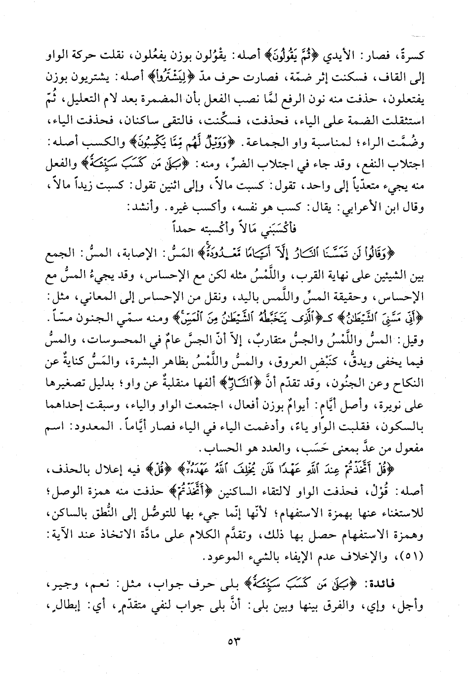 وقيل: المسُّ واللَّمْسُ والجسُّ متقاربٌ، إلّا أنّ الجسَّ عامٌ في المحسوسات، والمسُّ فيما يخفى ويدقُّ، كنَبْضِ العروق، والمسُّ واللَّمْسُ بظاهر البشرة، والمَسُّ كنايةٌ عن النكاح وعن الجنُون، وقد تقدّم أنَّ {النَّارُ} ألفها منقلبةٌ عن واو؛ بدليل تصغيرها على نويرة، وأصل أيَّامٍ: أيوامٌ بوزن أفعال، اجتمعت الواو والياء، وسبقت إحداهما بالسكون، فقلبت الواو ياءً، وأدغمت الياء في الياء فصار أيَّامًا. المعدود: اسم مفعول من عدَّ بمعنى حَسَب، والعدد هو الحساب.