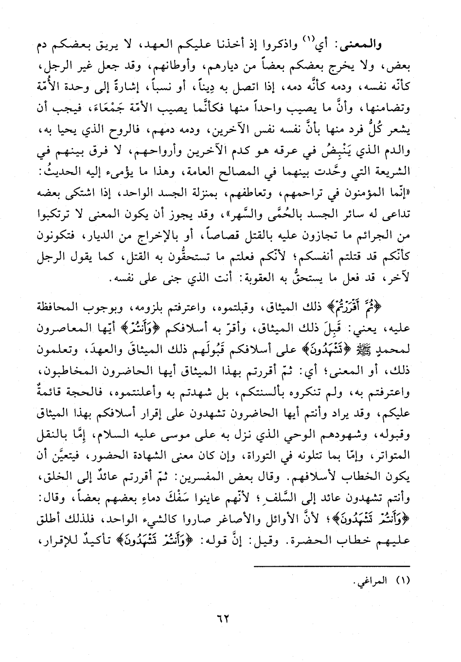والمعنى: أي (¬1) واذكروا إذ أخذنا عليكم العهد، لا يريق بعضكم دم بعض، ولا يخرج بعضكم بعضًا من ديارهم، وأوطانهم، وقد جعل غير الرجل، كأنّه نفسه، ودمه كأنَّه دمه، إذا اتصل به دِينًا، أو نسبًا، إشارةً إلى وحدة الأُمّة وتضامنها، وأنَّ ما يصيب واحدًا منها فكأنَّما يصيب الأمّة جَمْعَاءَ، فيجب أن يشعر كُلُّ فرد منها بأنَّ نفسه نفس الآخرين، ودمه دمهم، فالروح الذي يحيا به، والدم الذي يَنْبِضُ في عرقه هو كدم الآخرين وأرواحهم، لا فرق بينهم في الشريعة التي وحَّدت بينهما في المصالح العامة، وهذا ما يؤْمىء إليه الحديثُ: "إنّما المؤمنون في تراحمهم، وتعاطفهم، بمنزلة الجسد الواحد، إذا اشتكى بعضه تداعى له سائر الجسد بالحُمَّى والسَّهر"، وقد يجوز أن يكون المعنى لا ترتكبوا من الجرائم ما تجازون عليه بالقتل قصاصًا، أو بالإخراج من الديار، فتكونون كأنّكم قد قتلتم أنفسكم؛ لأنّكم فعلتم ما تستحقُّون به القتل، كما يقول الرجل لآخر، قد فعل ما يستحقُّ به العقوبة: أنت الذي جنى على نفسه.