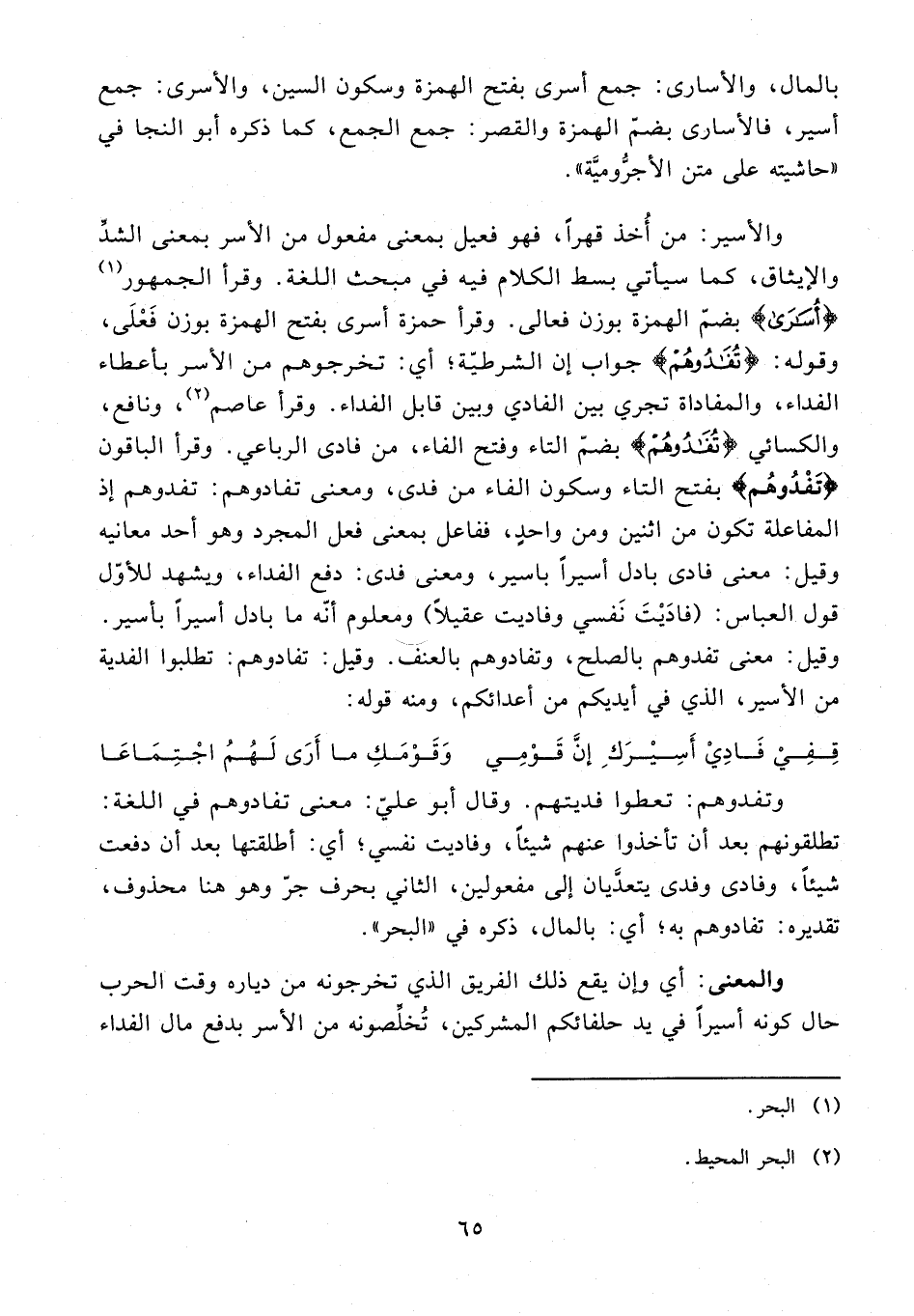 والأسير: من أُخذ قهرًا، فهو فعيل بمعنى مفعول من الأسر بمعنى الشدِّ والإيثاق، كما سيأتي بسط الكلام فيه في مبحث اللغة. وقرأ الجمهور (¬1) {أُسَارَى} بضمّ الهمزة بوزن فعالى. وقرأ حمزة أسرى بفتح الهمزة بوزن فَعْلَى، وقوله: {تُفَادُوهُمْ} جواب إن الشرطيّة؛ أي: تخرجوهم من الأسر بأعطاء الفداء، والمفاداة تجري بين الفادي وبين قابل الفداء. وقرأ عاصم (¬2)، ونافع، والكسائي {تُفَادُوهُمْ} بضمّ التاء وفتح الفاء، من فادى الرباعي. وقرأ الباقون {تَفْدُوهُم} بفتح التاء وسكون الفاء من فدى، ومعنى تفادوهم: تفدوهم إذ المفاعلة تكون من اثنين ومن واحدٍ، ففاعل بمعنى فعل المجرد وهو أحد معانيه وقيل: معنى فادى بادل أسيرًا بأسير، ومعنى فدى: دفع الفداء، ويشهد للأوّل قول العباس: (فادَيْتَ نَفسي وفاديت عقيلًا) ومعلوم أنّه ما بادل أسيرًا بأسير. وقيل: معنى تفدوهم بالصلح، وتفادوهم بالعنف. وقيل. تفادوهم: تطلبوا الفدية من الأسير، الذي في أيديكم من أعدائكم، ومنه قوله:
