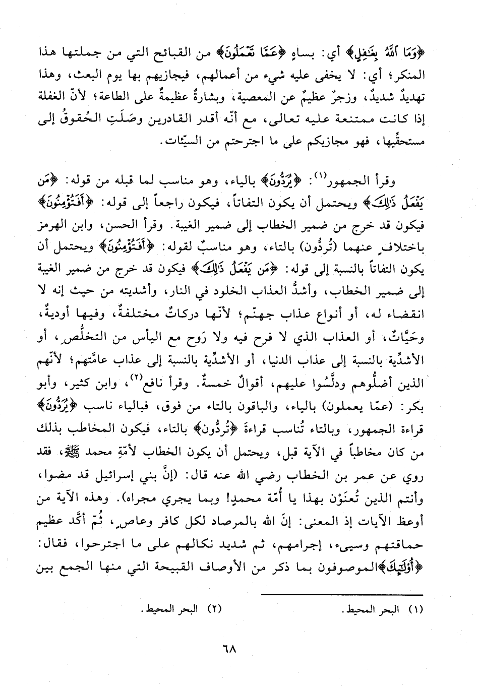 وقرأ الجمهور (¬1): {يُرَدُّونَ} بالياء، وهو مناسب لما قبله من قوله: {مَنْ يَفْعَلُ ذَلِكَ} ويحتمل أن يكون التفاتًا، فيكون راجعًا إلى قوله: {أَفَتُؤْمِنُونَ} فيكون قد خرج من ضمير الخطاب إلى ضمير الغيبة. وقرأ الحسن، وابن الهرمز باختلاف عنهما (تُردُّون) بالتاء، وهو مناسبٌ لقوله: {أَفَتُؤْمِنُونَ} ويحتمل أن يكون التفاتًا بالنسبة إلى قوله: {مَنْ يَفْعَلُ ذَلِكَ} فيكون قد خرج من ضمير الغيبة إلى ضمير الخطاب، وأشدُّ العذاب الخلود في النار، وأشديته من حيث إنه لا انقضاء له، أو أنواع عذاب جهنّم؛ لأنّها دركاتٌ مختلفةٌ، وفيها أوديةٌ، وحَيَّاتٌ، أو العذاب الذي لا فرح فيه ولا رَوح مع اليأس من التخلُّصِ، أو الأشدِّية بالنسبة إلى عذاب الدنيا، أو الأشدِّية بالنسبة إلى عذاب عامَّتهم؛ لأنّهم الذين أضلُّوهم ودلَّسُوا عليهم، أقوالٌ خمسةٌ. وقرأ نافع (¬2)، وابن كثير، وأبو بكر: (عمّا يعملون) بالياء، والباقون بالتاء من فوق، فبالياء ناسب {يُرَدُّونَ} قراءة الجمهور، وبالتاء تُناسب قراءةَ {تُردُّون} بالتاء، فيكون المخاطب بذلك من كان مخاطبًا في الآية قبل، ويحتمل أن يكون الخطاب لأمّةِ محمد - صلى الله عليه وسلم -، فقد روي عن عمر بن الخطاب رضي الله عنه قال: (إنَّ بني إسرائيل قد مضوا، وأنتم الذين تُعنَوْن بهذا يا أُمّة محمدٍ! وبما يجري مجراه). وهذه الآية من أوعظ الآيات إذ المعنى: إنّ الله بالمرصاد لكل كافرٍ وعاصٍ، ثُمَّ أكَّد عظيم حماقتهم وسيىء، إجرامهم، ثم شديد نكالهم على ما اجترحوا، فقال: