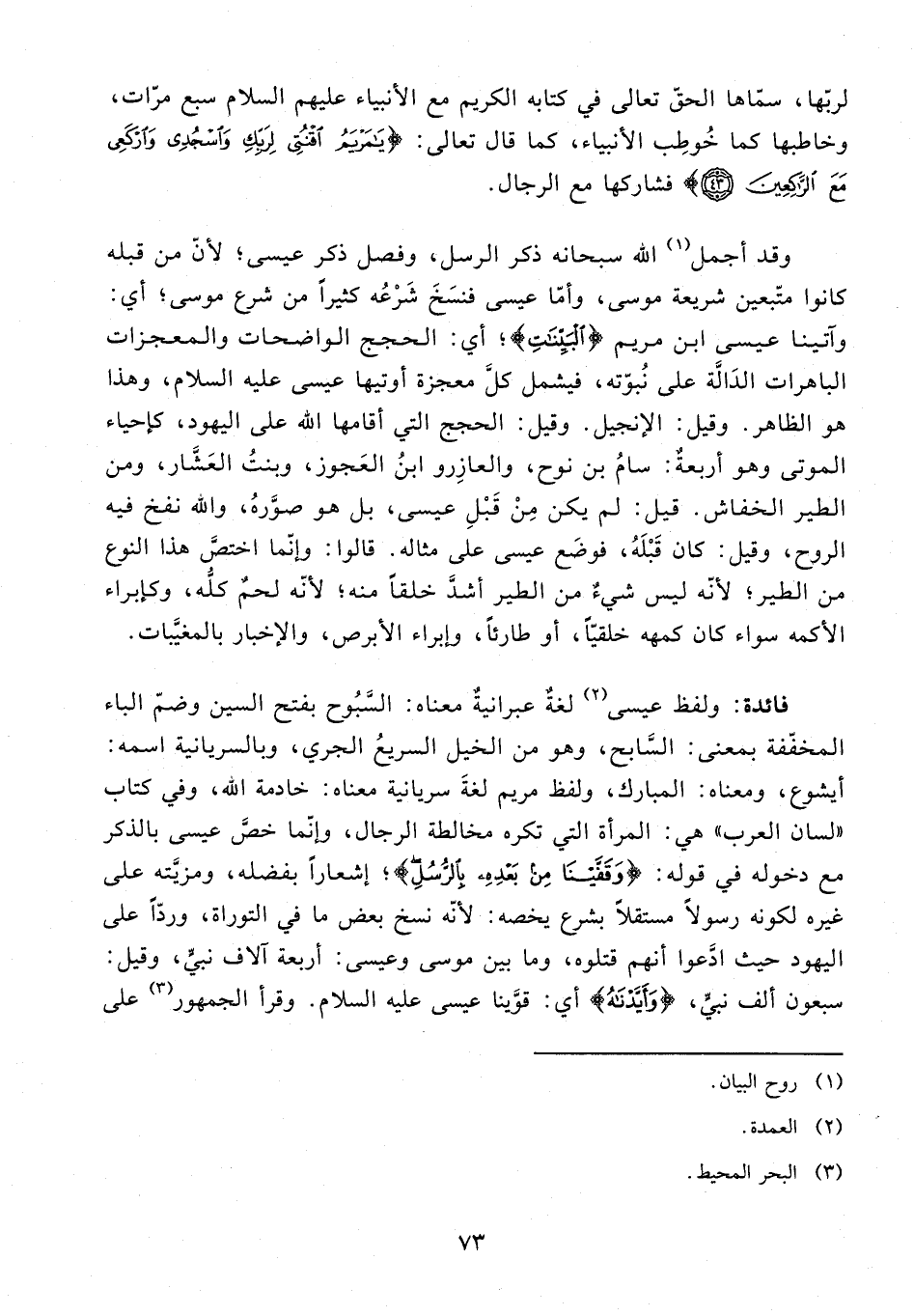 فائدة: ولفظ عيسى (¬2) لغةٌ عبرانيةٌ معناه: السَّبُوح بفتح السين وضمّ الباء المخفّفة بمعنى: السَّابح، وهو من الخيل السريعُ الجري، وبالسريانية اسمه: أيشوع، ومعناه: المبارك، ولفظ مريم لغة سريانية معناه: خادمة الله، وفي كتاب "لسان العرب" هي: المرأة التي تكره مخالطة الرجال، وإنّما خصَّ عيسى بالذكر مع دخوله في قوله: {وَقَفَّيْنَا مِنْ بَعْدِهِ بِالرُّسُلِ}؛ إشعارًا بفضله، ومزيَّته على غيره لكونه رسولًا مستقلًّا بشرع يخصه: لأنّه نسخ بعض ما في التوراة، وردًّا على اليهود حيث ادَّعوا أنهم قتلوه، وما بين موسى وعيسى: أربعة آلاف نبيٍّ، وقيل: سبعون ألف نبيٍّ، {وَأَيَّدْنَاهُ} أي: قوَّينا عيسى عليه السلام. وقرأ الجمهور (¬3) على