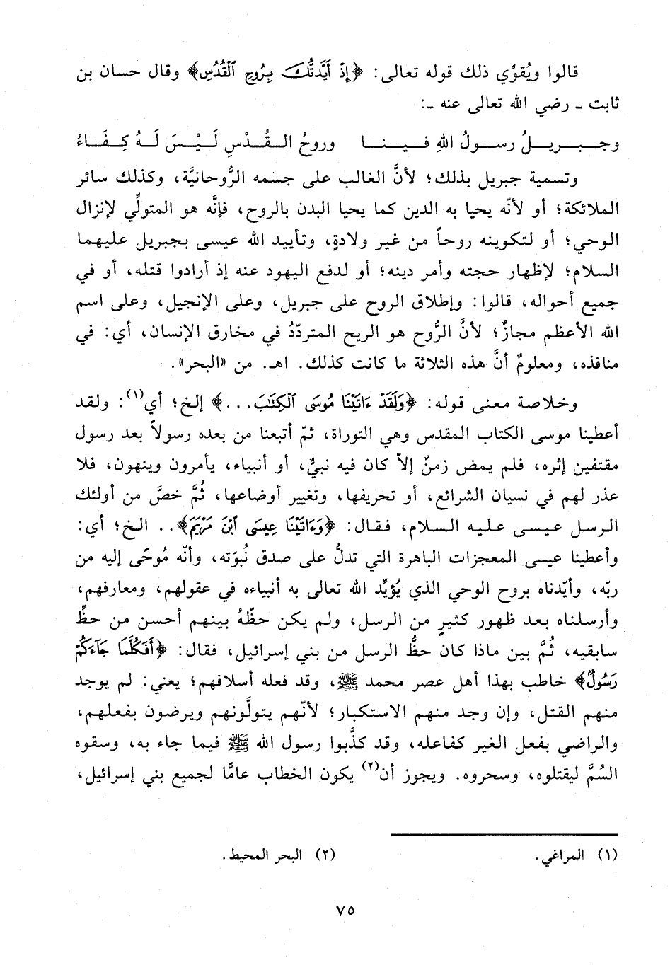 وتسمية جبريل بذلك؛ لأنَّ الغالب على جسمه الرُّوحانيَّة، وكذلك سائر الملائكة؛ أو لأنّه يحيا به الدين كما يحيا البدن بالروح، فإنَّه هو المتولِّي لإنزال الوحي؛ أو لتكوينه روحًا من غير ولادةٍ، وتأييد الله عيسى بجبريل عليهما السلام؛ لإظهار حجته وأمر دينه؛ أو لدفع اليهود عنه إذ أرادوا قتله، أو في جميع أحواله، قالوا: وإطلاق الروح على جبريل، وعلى الإنجيل، وعلى اسم الله الأعظم مجازٌ؛ لأنَّ الرُّوح هو الريح المتردّدُ في مخارق الإنسان، أي: في منافذه، ومعلومٌ أنَّ هذه الثلاثة ما كانت كذلك. اهـ. من "البحر".