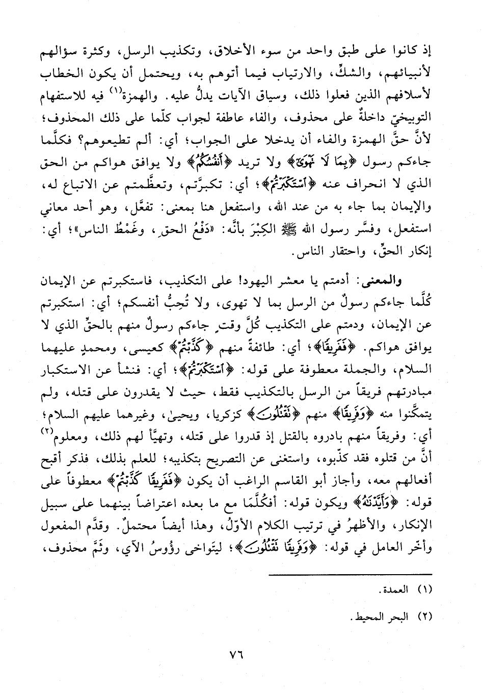 إذ كانوا على طبق واحد من سوء الأخلاق، وتكذيب الرسل، وكثرة سؤالهم لأنبيائهم، والشكِّ، والارتياب فيما أتوهم به، ويحتمل أن يكون الخطاب لأسلافهم الذين فعلوا ذلك، وسياق الآيات يدلُّ عليه. والهمزة (¬1) فيه للاستفهام التوبيخيّ داخلةٌ على محذوف، والفاء عاطفة لجواب كلّما على ذلك المحذوف؛ لأنَّ حقَّ الهمزة والفاء أن يدخلا على الجواب؛ أي: ألم تطيعوهم؟ فكلَّما جاءكم رسول {بِمَا لَا تَهْوَى} ولا تريد {أَنْفُسُكُمُ} ولا يوافق هواكم من الحق الذي لا انحراف عنه {اسْتَكْبَرْتُمْ}؛ أي: تكبَّرتم، وتعظَّمتم عن الاتباع له، والإيمان بما جاء به من عند الله، واستفعل هنا بمعنى: تفعَّل، وهو أحد معاني استفعل، وفسَّر رسول الله - صلى الله عليه وسلم - الكِبْرَ بأنَّه: "دَفْعُ الحقِ، وغَمْطُ الناس"؛ أي: إنكار الحقِّ، واحتقار الناس.