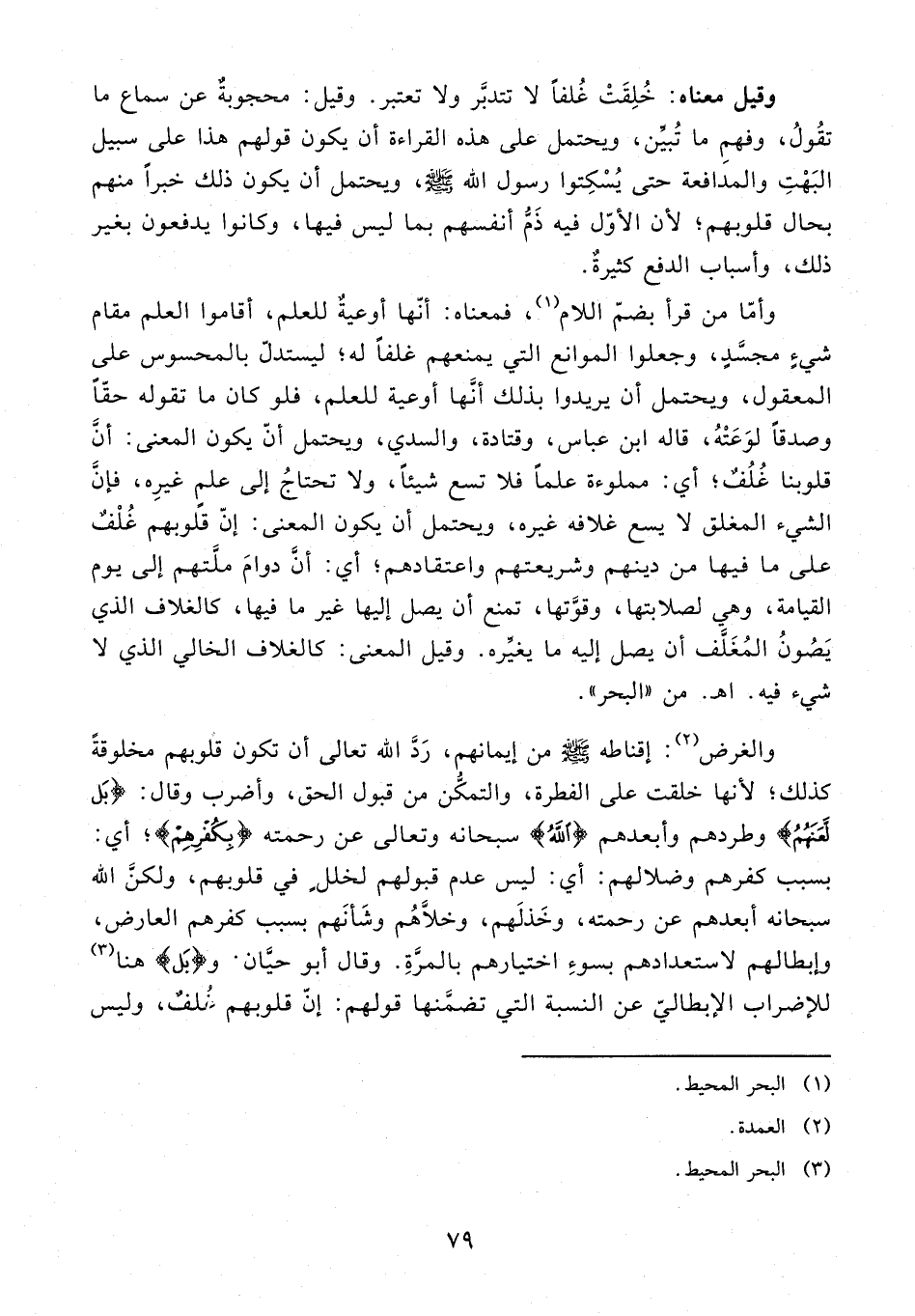 وأمّا من قرأ بضمّ اللام (¬1)، فمعناه: أنّها أوعيةٌ للعلم، أقاموا العلم مقام شيءٍ مجسَّدٍ، وجعلوا الموانع التي يمنعهم غلفًا له؛ ليستدلّ بالمحسوس على المعقول، ويحتمل أن يريدوا بذلك أنَّها أوعية للعلم، فلو كان ما تقوله حقًّا وصدقًا لوَعَتْهُ، قاله ابن عباس، وقتادة، والسدي، ويحتمل أنّ يكون المعنى: أنَّ قلوبنا غُلُفٌ؛ أي: مملوءة علمًا فلا تسع شيئًا، ولا تحتاجُ إلى علمٍ غيرِه، فإنَّ الشيء المغلق لا يسع غلافه غيره، ويحتمل أن يكون المعنى: إنّ قلوبهم غُلْفٌ على ما فيها من دينهم وشريعتهم واعتقادهم؛ أي: أنَّ دوامَ ملَّتهم إلى يوم القيامة، وهي لصلابتها، وقوَّتها، تمنع أن يصل إليها غير ما فيها، كالغلاف الذي يَصُونُ المُغَلَّف أن يصل إليه ما يغيِّره. وقيل المعنى: كالغلاف الخالي الذي لا شيء فيه. اهـ. من "البحر".