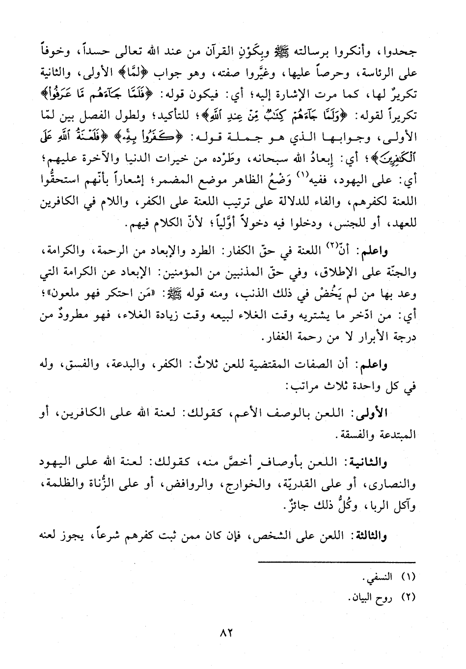 واعلم: أن الصفات المقتضية للعن ثلاثٌ: الكفر، والبدعة، والفسق، وله في كل واحدة ثلاث مراتب: