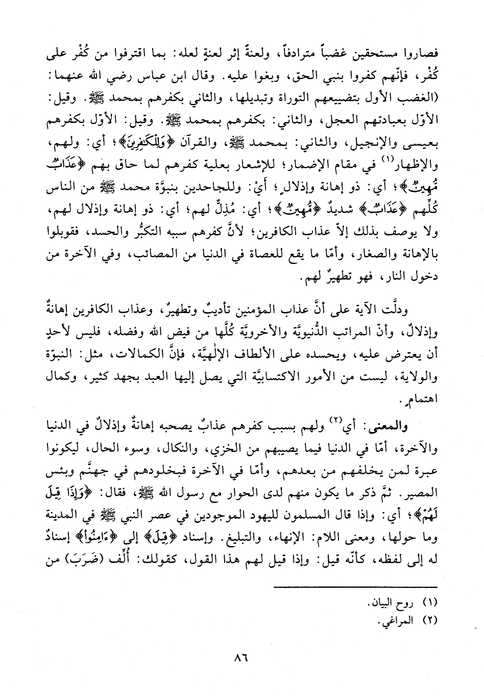 فصاروا مستحقين غضبًا مترادفًا، ولعنةً إثر لعنةٍ لعله: بما اقترفوا من كُفْر على كُفْر، فإنّهم كفروا بنبي الحق، وبغوا عليه. وقال ابن عباس رضي الله عنهما: (الغضب الأول بتضييعهم التوراة وتبديلها، والثاني بكفرهم بمحمد - صلى الله عليه وسلم -. وقيل: الأوّل بعبادتهم العجل، والثاني: بكفرهم بمحمد - صلى الله عليه وسلم -. وقيل: الأوّل بكفرهم بعيسى والإنجيل، والثاني: بمحمد - صلى الله عليه وسلم -، والقرآن {وَلِلْكَافِرِينَ}؛ أي: ولهم، والإظهار (¬1) في مقام الإضمار؛ للإشعار بعلية كفرهم لما حاق بهم {عَذَابٌ مُهِينٌ}؛ أي: ذو إهانة وإذلالٍ؛ أَيْ: وللجاحدين بنبوَّة محمد - صلى الله عليه وسلم - من الناس كُلِّهم {عَذَابٌ} شديدٌ {مُهِينٌ}؛ أي: مُذِلٌّ لهم؛ أي: ذو إهانة وإذلال لهم، ولا يوصف بذلك إلّا عذاب الكافرين؛ لأن كفرهم سببه التكبُّر والحسد، فقوبلوا بالإهانة والصغار، وأمّا ما يقع للعصاة في الدنيا من المصائب، وفي الآخرة من دخول النار، فهو تطهيرٌ لهم.