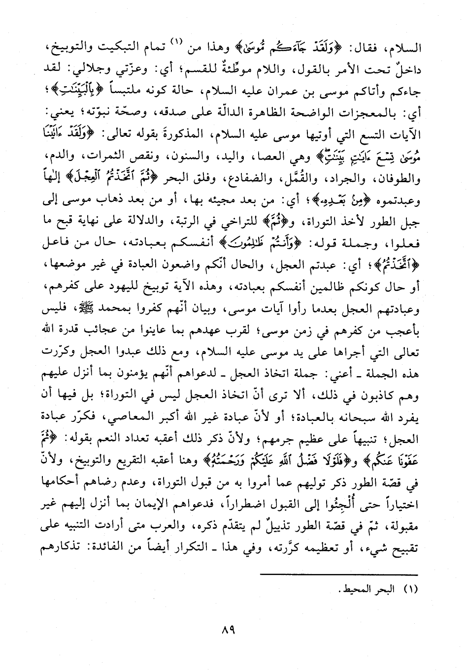 السلام، فقال: {وَلَقَدْ جَاءَكُمْ مُوسَى} وهذا من (¬1) تمام التبكيت والتوبيخ، داخلٌ تحت الأمر بالقول، واللام موطِّئةٌ للقسم؛ أي: وعزّتي وجلالي: لقد جاءكم وأتاكم موسى بن عمران عليه السلام، حالة كونه ملتبسًا {بِالْبَيِّنَاتِ}؛ أي: بالمعجزات الواضحة الظاهرة الدالّة على صدقه، وصحّة نبوّته؛ يعني: الآيات التسع التي أوتيها موسى عليه السلام، المذكورةَ بقوله تعالى: {وَلَقَدْ آتَيْنَا مُوسَى تِسْعَ آيَاتٍ بَيِّنَاتٍ} وهي العصا، واليد، والسنون، ونقص الثمرات، والدم، والطوفان، والجراد، والقُمَّل، والضفادع، وفلق البحر {ثُمَّ اتَّخَذْتُمُ الْعِجْلَ} إلهًا وعبدتموه {مِنْ بَعْدِهِ}؛ أي: من بعد مجيئه بها، أو من بعد ذهاب موسى إلى جبل الطور لأخذ التوراة، و {ثُمَّ} للتراخي في الرتبة، والدلالة على نهاية قبح ما فعلوا، وجملة قوله: {وَأَنْتُمْ ظَالِمُونَ} أنفسكم بعبادته، حال من فاعل {اتخذْتُمُ}؛ أي: عبدتم العجل، والحال أنّكم واضعون العبادة في غير موضعها، أو حال كونكم ظالمين أنفسكم بعبادته، وهذه الآية توبيخ لليهود على كفرهم، وعبادتهم العجل بعدما رأوا آيات موسى، وبيان أنّهم كفروا بمحمد - صلى الله عليه وسلم -، فليس بأعجب من كفرهم في زمن موسى؛ لقرب عهدهم بما عاينوا من عجائب قدرة الله تعالى التي أجراها على يد موسى عليه السلام، ومع ذلك عبدوا العجل وكرّرت هذه الجملة - أعني: جملة اتخاذ العجل - لدعواهم أنّهم يؤمنون بما أنزل عليهم وهم كاذبون في ذلك، ألا ترى أنّ اتخاذ العجل ليس في التوراة؛ بل فيها أن يفرد الله سبحانه بالعبادة؛ أو لأنّ عبادة غير الله أكبر المعاصي، فكرّر عبادة العجل؛ تنبيهًا على عظيم جرمهم؛ ولأنّ ذكر ذلك أعقبه تعداد النعم بقوله: {ثُمَّ عَفَوْنَا عَنْكُمْ} و {فَلَوْلَا فَضْلُ اللَّهِ عَلَيْكُمْ وَرَحْمَتُهُ} وهنا أعقبه التقريع والتوبيخ، ولأنّ في قصّة الطور ذكر توليهم عما أمروا به من قبول التوراة، وعدم رضاهم أحكامها اختيارًا حتى أُلْجِئُوا إلى القبول اضطرارًا، فدعواهم الإيمان بما أنزل إليهم غير مقبولة، ثمّ في قصّة الطور تذييلٌ لم يتقدّم ذكره، والعرب متى أرادت التنبيه على تقبيح شيء، أو تعظيمه كرَّرته، وفي هذا - التكرار أيضًا من الفائدة: تذكارهم