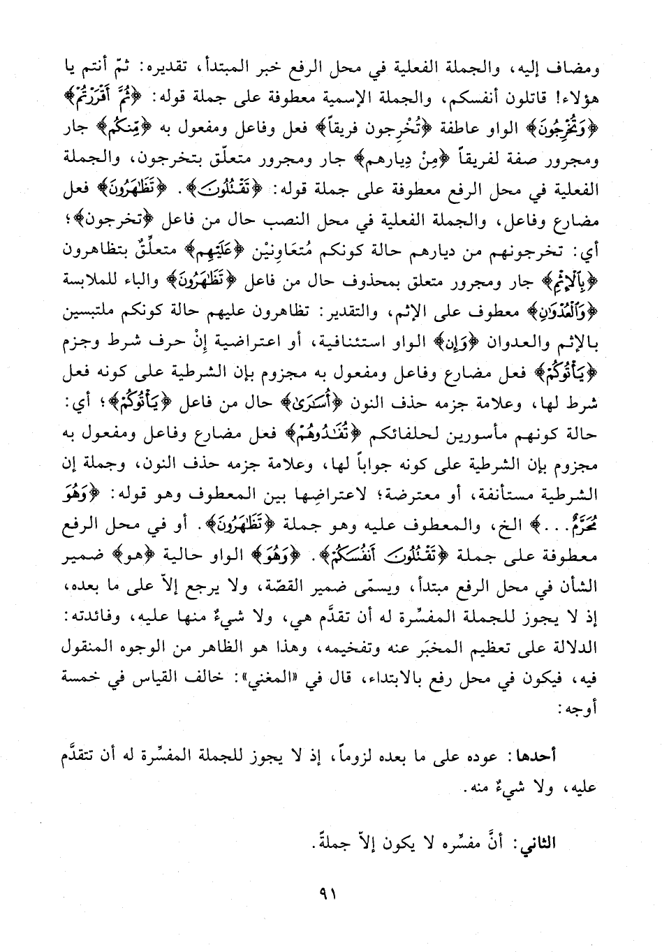 ومضاف إليه، والجملة الفعلية في محل الرفع خبر المبتدأ، تقديره: ثمّ أنتم يا هؤلاء! قاتلون أنفسكم، والجملة الاسمية معطوفة على جملة قوله: {ثُمَّ أَقْرَرْتُمْ} {وَتُخْرِجُونَ} الواو عاطفة {تُخْرِجون فريقًا} فعل وفاعل ومفعول به {مِنْكُمْ} جار ومجرور صفة لفريقًا {مِنْ دِيارهم} جار ومجرور متعلّق بتخرجون، والجملة الفعلية في محل الرفع معطوفة على جملة قوله: {تَقْتُلُونَ}. {تَظَاهَرُونَ} فعل مضارع وفاعل، والجملة الفعلية في محل النصب حال من فاعل {تخرجون}؛ أي: تخرجونهم من ديارهم حالة كونكم مُتعَاوِنيْن {عَلَيْهِمْ} متعلِّقٌ بتظاهرون {بِالْإِثْمِ} هو جار ومجرور متعلق بمحذوف حال من فاعل {تَظَاهَرُونَ} والباء للملابسة {وَالْعُدْوَانِ} معطوف على الإثم، والتقدير: تظاهرون عليهم حالة كونكم ملتبسين بالإثم والعدوان {وَإِنْ} الواو استئنافية، أو اعتراضية إِنْ حرف شرط وجزم {يَأْتُوكُمْ} فعل مضارع وفاعل ومفعول به مجزوم بإن الشرطية على كونه فعل شرط لها، وعلامة جزمه حذف النون {أُسَارَى} حال من فاعل {يَأْتُوكُمْ}؛ أي: حالة كونهم مأسورين لحلفائكم {تُفَادُوهُمْ} فعل مضارع وفاعل ومفعول به مجزوم بإن الشرطية على كونه جوابًا لها، وعلامة جزمه حذف النون، وجملة إن الشرطية مستأنفة، أو معترضة؛ لاعتراضِها بين المعطوف وهو قوله: {وَهُوَ مُحَرَّمٌ ...} الخ، والمعطوف عليه وهو جملة {تَظَاهَرُونَ}. أو في محل الرفع معطوفة على جملة {تَقْتُلُونَ أَنْفُسَكُمْ}. {وَهُوَ} الواو حالية {هو} ضمير الشأن في محل الرفع مبتدأ، ويسمّى ضمير القصّة، ولا يرجع إلّا على ما بعده، إذ لا يجوز للجملة المفسِّرة له أن تقدَّم هي، ولا شيءٌ منها عليه، وفائدته: الدلالة على تعظيم المخبَر عنه وتفخيمه، وهذا هو الظاهر من الوجوه المنقول فيه، فيكون في محل رفع بالابتداء، قال في "المغني": خالف القياس في خمسة أوجه: