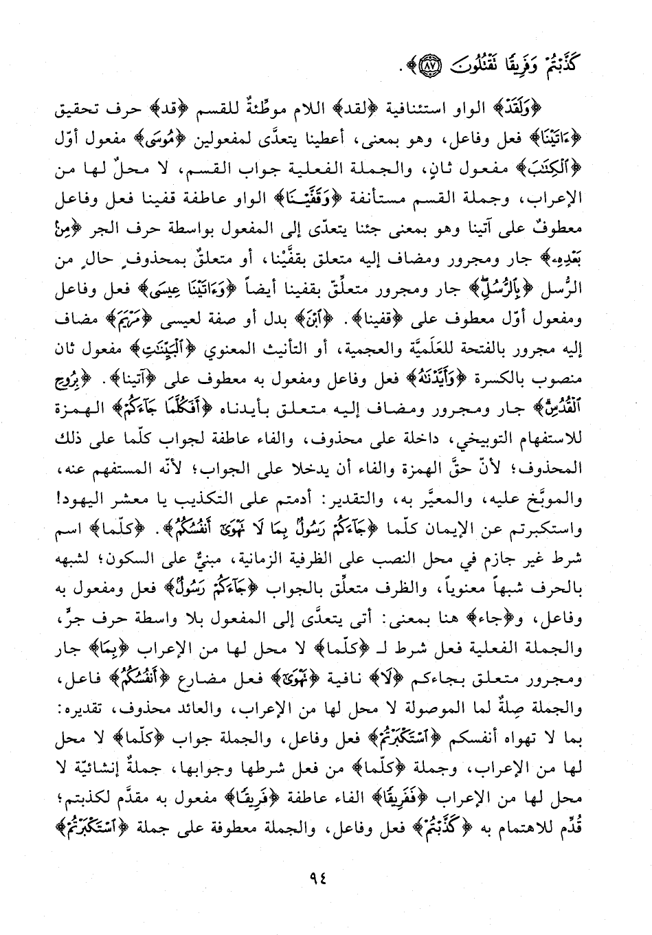 {وَلَقَدْ} الواو استئنافية {لقد} اللام موطِّئةٌ للقسم {قد} حرف تحقيق {آتَيْنَا} فعل وفاعل، وهو بمعنى، أعطينا يتعدَّى لمفعولين {مُوسَى} مفعول أوّل {الْكِتَابَ} مفعول ثانٍ، والجملة الفعلية جواب القسم، لا محلٌ لها من الإعراب، وجملة القسم مستأنفة {وَقَفَّيْنَا} الواو عاطفة قفينا فعل وفاعل معطوفٌ على آتينا وهو بمعنى جئنا يتعدّى إلى المفعول بواسطة حرف الجر {مِنْ بَعْدِهِ} جار ومجرور ومضاف إليه متعلق بقفَّيْنا، أو متعلقٌ بمحذوفٍ حال من الرُّسل {بِالرُّسُلِ} جار ومجرور متعلِّق بقفينا أيضًا {وَآتَيْنَا عِيسَى} فعل وفاعل ومفعول أوّل معطوف على {قفينا}. {ابْنَ} هو بدل أو صفة لعيسى {مَرْيَمَ} مضاف إليه مجرور بالفتحة للعَلَميَّة والعجمية، أو التأنيث المعنوي {الْبَيِّنَاتِ} مفعول ثان منصوب بالكسرة {وَأَيَّدْنَاهُ} فعل وفاعل ومفعول به معطوف على {آتينا}. {بِرُوحِ الْقُدُسِ} جار ومجرور ومضاف إليه متعلق بأيدناه {أَفَكُلَّمَا جَاءَكُمْ} الهمزة للاستفهام التوبيخي، داخلة على محذوف، والفاء عاطفة لجواب كلّما على ذلك المحذوف؛ لأنّ حقَّ الهمزة والفاء أن يدخلا على الجواب؛ لأنّه المستفهم عنه، والموبَّخ عليه، والمعيَّر به، والتقدير: أدمتم على التكذيب يا معشر اليهود! واستكبرتم عن الإيمان كلّما {جَاءَكُمْ رَسُولٌ بِمَا لَا تَهْوَى أَنْفُسُكُمُ}. {كلّما} اسم شرط غير جازم في محل النصب على الظرفية الزمانية، مبنيٌّ على السكون؛ لشبهه بالحرف شبهًا معنويًّا، والظرف متعلِّق بالجواب {جَاءَكُمْ رَسُولٌ} فعل ومفعول به وفاعل، و {جاء} هنا بمعنى: أتى يتعدَّى إلى المفعول بلا واسطة حرف جرٍّ، والجملة الفعلية فعل شرط لـ {كلّما} لا محل لها من الإعراب {بِمَا} جار ومجرور متعلق بجاءكم {لَا} نافية {تَهْوَى} فعل مضارع {أَنْفُسُكُمُ} فاعل، والجملة صِلةٌ لما الموصولة لا محل لها من الإعراب، والعائد محذوف، تقديره: بما لا تهواه أنفسكم {اسْتَكْبَرْتُمْ} فعل وفاعل، والجملة جواب {كُلَّمَا} لا محل لها من الإعراب، وجملة {كلّما} من فعل شرطها وجوابها، جملةٌ إنشائيّة لا محل لها من الإعراب {فَفَرِيقًا} الفاء عاطفة {فَرِيقًا} مفعول به مقدَّم لكذبتم؛ قُدِّم للاهتمام به {كَذَّبْتُمْ} فعل وفاعل، والجملة معطوفة على جملة {اسْتَكْبَرْتُمْ}