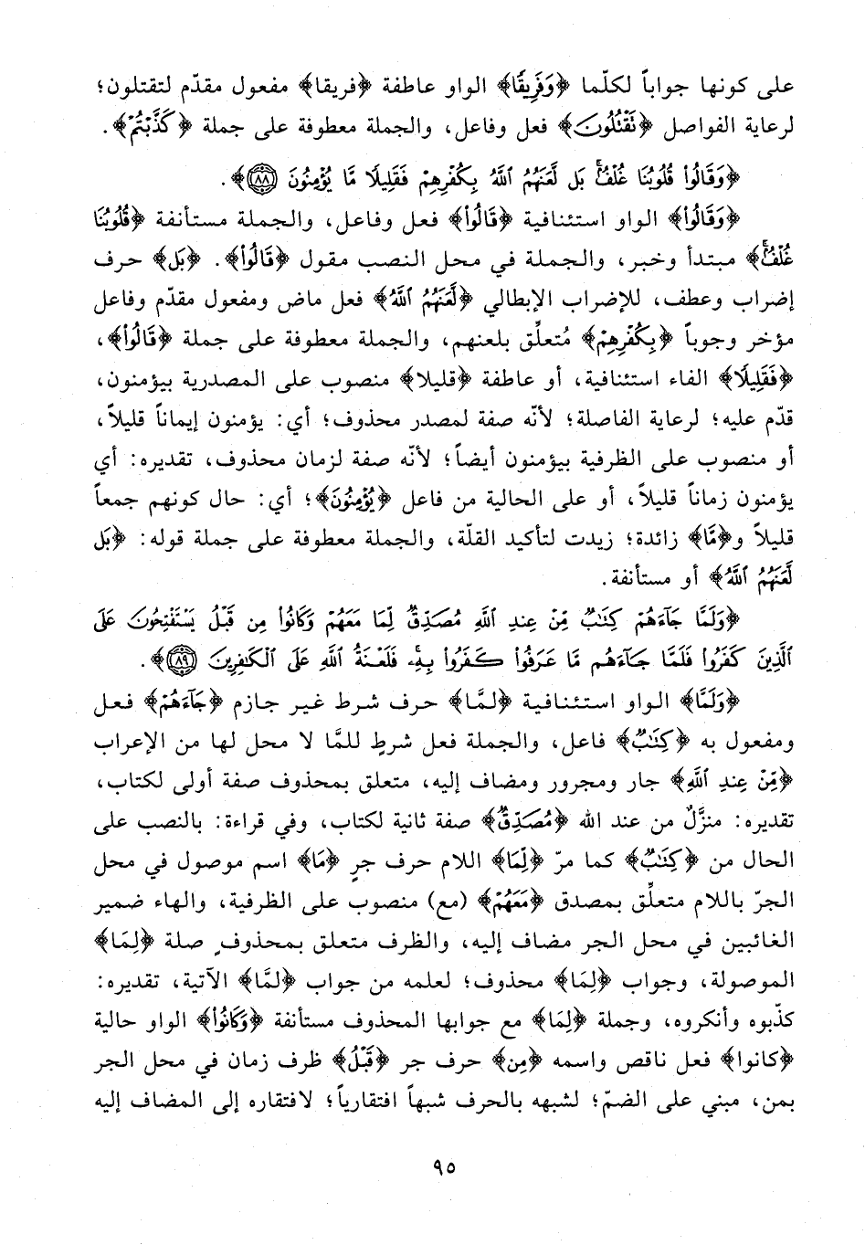 {وَقَالُوا} الواو استئنافية {قَالُوا} فعل وفاعل، والجملة مستأنفة {قُلُوبُنَا غُلْفٌ} مبتدأ وخبر، والجملة في محل النصب مقول {قَالُوا}. {بَلْ} حرف إضراب وعطف، للإضراب الإبطالي {لَعَنَهُمُ اللَّهُ} فعل ماض ومفعول مقدّم وفاعل مؤخر وجوبًا {بِكُفْرِهِمْ} مُتعلِّق بلعنهم، والجملة معطوفة على جملة {قَالُوا}، {فَقَلِيلًا} الفاء استئنافية، أو عاطفة {قليلًا} منصوب على المصدرية بيؤمنون، قدّم عليه؛ لرعاية الفاصلة؛ لأنّه صفة لمصدر محذوف؛ أي: يؤمنون إيمانًا قليلًا، أو منصوب على الظرفية بيؤمنون أيضًا؛ لأنّه صفة لزمان محذوف، تقديره: أي يؤمنون زمانًا قليلًا، أو على الحالية من فاعل {يُؤْمِنُونَ}؛ أي: حال كونهم جمعًا قليلًا و {مَا} زائدة؛ زيدت لتأكيد القلّة، والجملة معطوفة على جملة قوله: {بَلْ لَعَنَهُمُ اللَّهُ} أو مستأنفة.