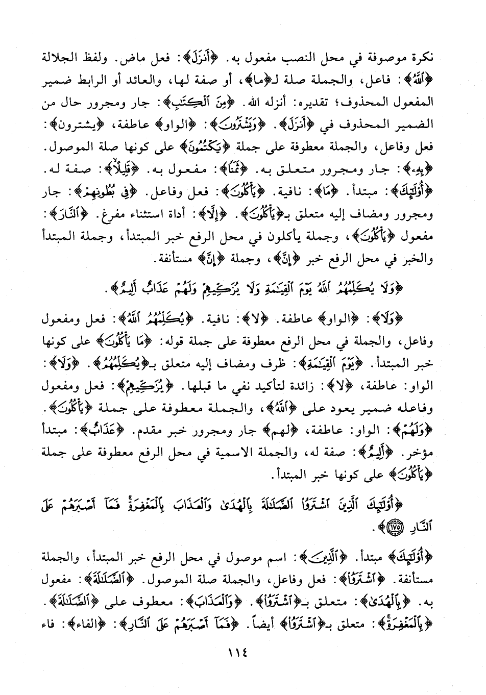 {وَلَا}: {الواو} عاطفة. {لا}: نافية. {يُكَلِّمُهُمُ اللَّهُ}: فعل ومفعول وفاعل، والجملة في محل الرفع معطوفة على جملة قوله: {مَا يَأْكُلُونَ} على كونها خبر المبتدأ. {يَوْمَ الْقِيَامَةِ}: ظرف ومضاف إليه متعلق بـ {يُكَلِّمُهُمُ}. {وَلَا}: الواو: عاطفة، {لا}: زائدة لتأكيد نفي ما قبلها. {يُزَكِّيهِمْ}: فعل ومفعول وفاعله ضمير يعود على {اللَّهُ}، والجملة معطوفة على جملة {يَأْكُلُونَ}. {وَلَهُمْ}: الواو: عاطفة، {لهم} جار ومجرور خبر مقدم. {عَذَابٌ}: مبتدأ مؤخر. {أَلِيمٌ}: صفة له، والجملة الإسمية في محل الرفع معطوفة على جملة {يَأْكُلُونَ} على كونها خبر المبتدأ.