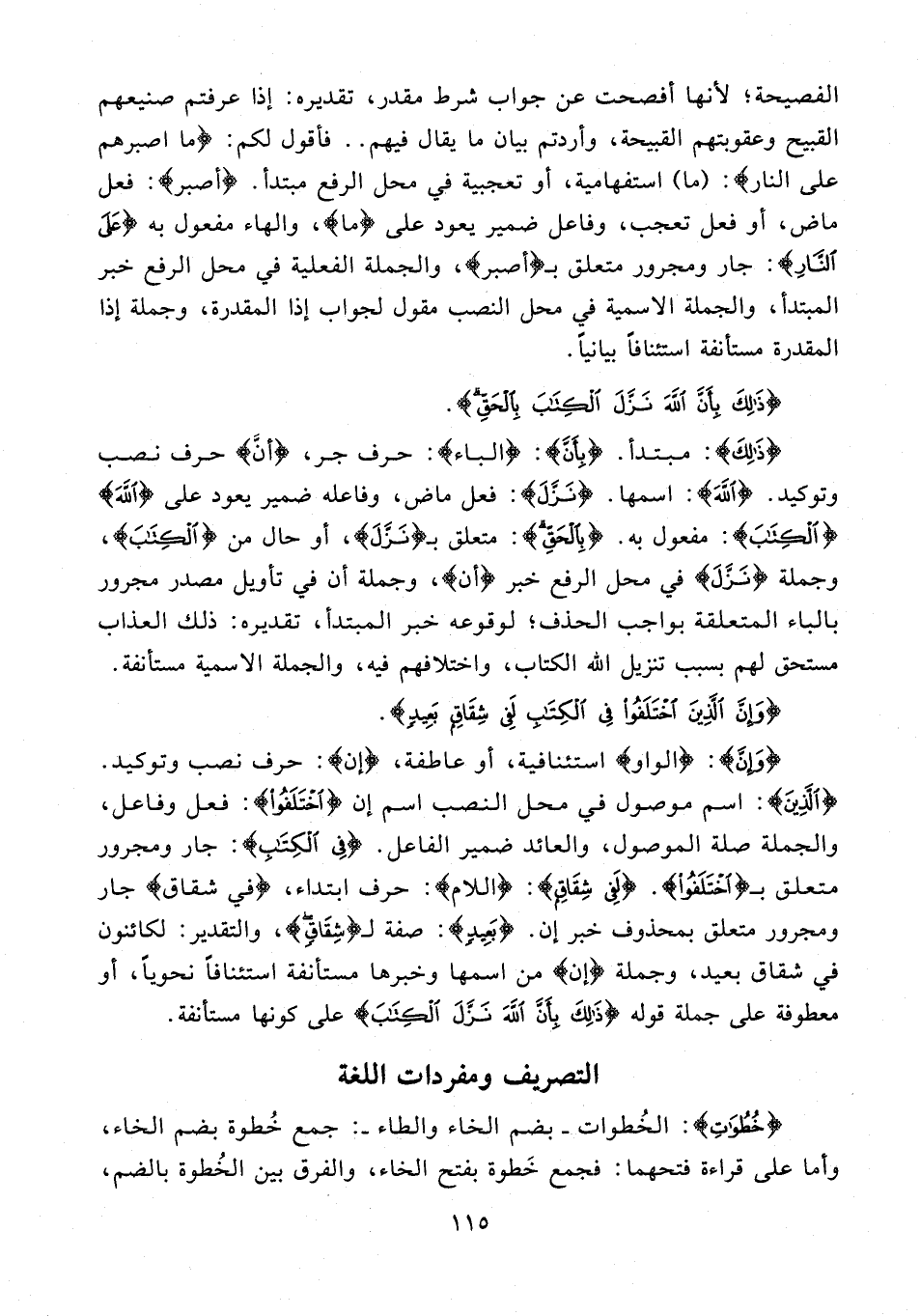 {ذَلِكَ}: مبتدأ. {بِأَنَّ}: {الباء}: حرف جر، {أنَّ} حرف نصب وتوكيد. {اللَّهَ}: اسمها. {نَزَّلَ}: فعل ماض، وفاعله ضمير يعود على {اللَّهَ} {الْكِتَابَ}: مفعول به. {بِالْحَقِّ}: متعلق بـ {نَزَّلَ}، أو حال من {الْكِتَابَ}، وجملة {نَزَّلَ} في محل الرفع خبر {أن}، وجملة أن في تأويل مصدر مجرور بالباء المتعلقة بواجب الحذف؛ لوقوعه خبر المبتدأ، تقديره: ذلك العذاب مستحق لهم بسبب تنزيل الله الكتاب، واختلافهم فيه، والجملة الإسمية مستأنفة.