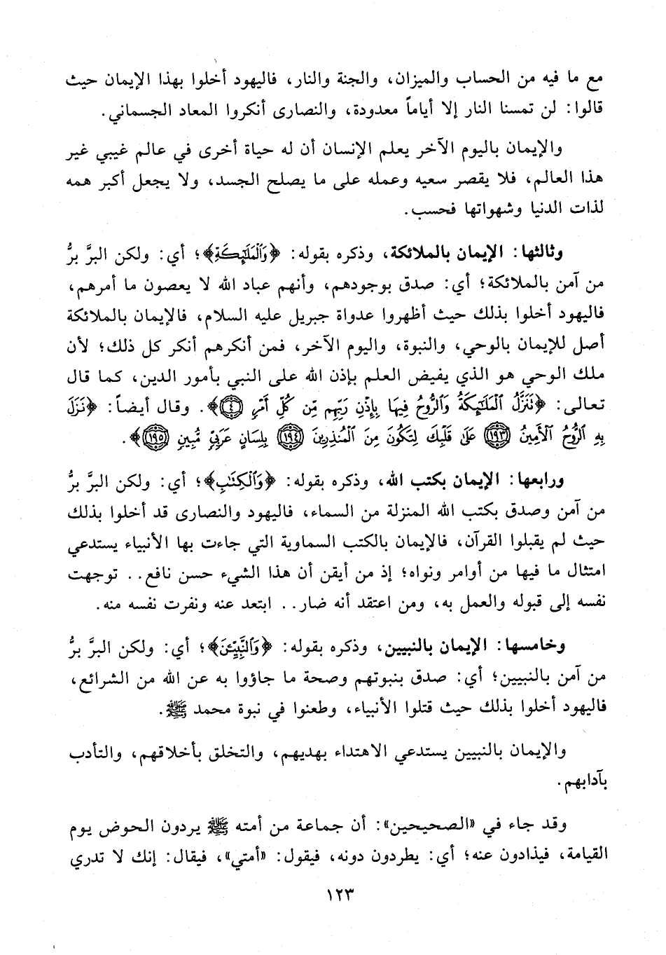 وثالثها: الإيمان بالملائكة، وذكره بقوله: {وَالْمَلَائِكَةِ}؛ أي: ولكن البرَّ برُّ من آمن بالملائكة؛ أي: صدق بوجودهم، وأنهم عباد الله لا يعصون ما أمرهم، فاليهود أخلوا بذلك حيث أظهروا عدواة جبريل عليه السلام، فالإيمان بالملائكة أصل للإيمان بالوحي، والنبوة، واليوم الآخر، فمن أنكرهم أنكر كل ذلك؛ لأن ملك الوحي هو الذي يفيض العلم بإذن الله على النبي بأمور الدين، كما قال تعالى: {تَنَزَّلُ الْمَلَائِكَةُ وَالرُّوحُ فِيهَا بِإِذْنِ رَبِّهِمْ مِنْ كُلِّ أَمْرٍ}. وقال أيضًا: {نَزَلَ بِهِ الرُّوحُ الْأَمِينُ (193) عَلَى قَلْبِكَ لِتَكُونَ مِنَ الْمُنْذِرِينَ (194) بِلِسَانٍ عَرَبِيٍّ مُبِينٍ (195)}.