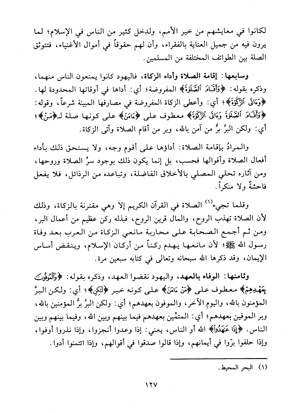 وسابعها: إقامة الصلاة وأداء الزكاة، فاليهود كانوا يمنعون الناس منهما، وذكره بقوله: {وَأَقَامَ الصَّلَاةَ} المفروضة؛ أي: أداها في أوقاتها المحدودة لها. {وَآتَى الزَّكَاةَ}؛ أي: وأعطى الزكاة المفروضة في مصارفها المبينة شرعًا، وقوله: {وَأَقَامَ الصَّلَاةَ وَآتَى الزَّكَاةَ} معطوف على {آمَنَ} على كونها صلة لـ {مَنْ}؛ أي: ولكن البرَّ برُّ من آمن بالله، وبر من أقام الصلاة وآتى الزكاة.