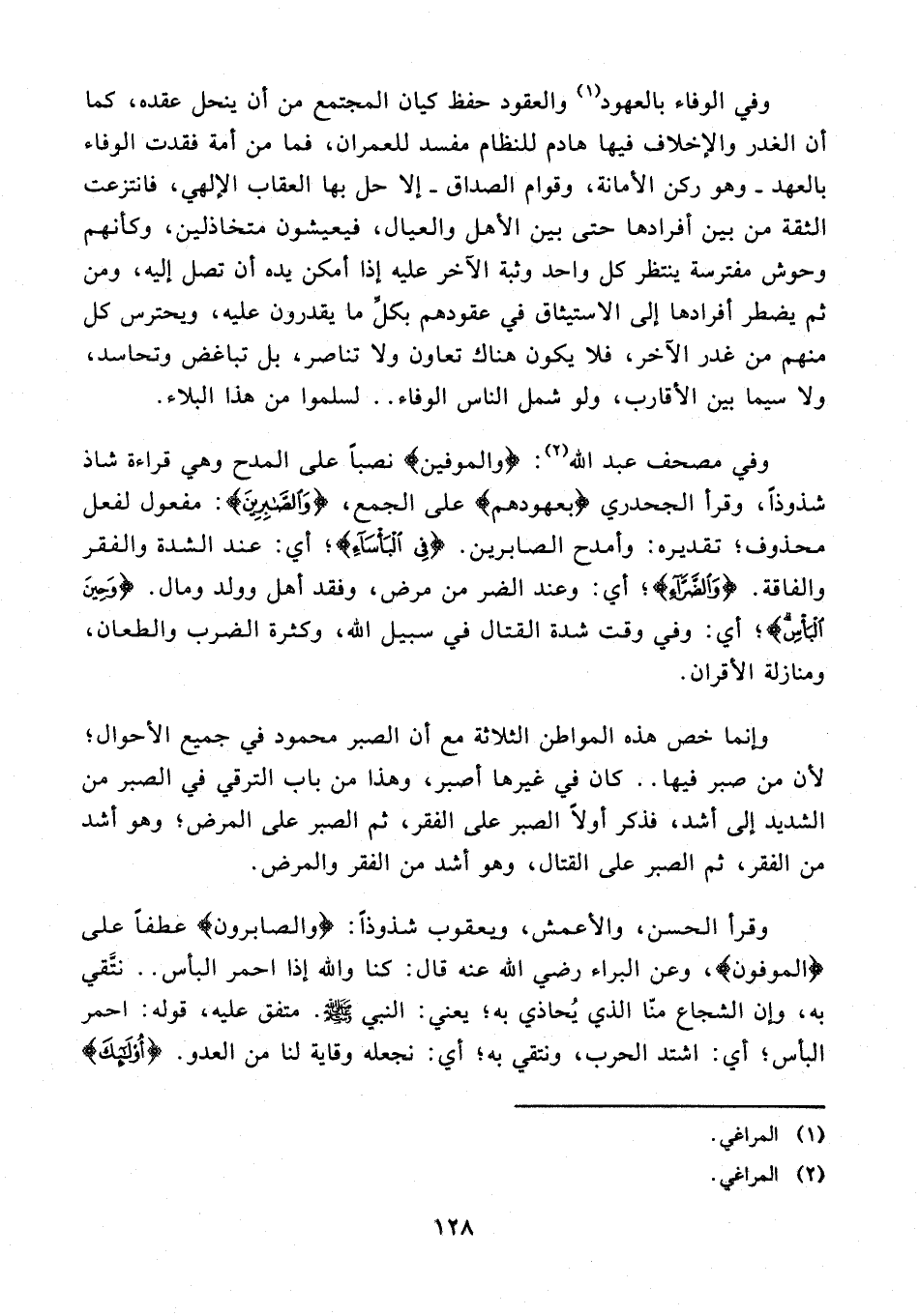 وفي مصحف عبد الله (¬2): {والموفين} نصبًا على المدح وهي قراءة شاذ شذوذًا، وقرأ الجحدري {بعهودهم} على الجمع، {وَالصَّابِرِينَ}: مفعول لفعل محذوف؛ تقديره: وأمدح الصابرين. {فِي الْبَأْسَاءِ}؛ أي: عند الشدة والفقر والفاقة. {وَالضَّرَّاءِ}؛ أي: وعند التفسير من مرض، وفقد أهل وولد ومال. {وَحِينَ الْبَأْسِ}؛ أي: وفي وقت شدة القتال في سبيل الله، وكثرة الضرب والطعان، ومنازلة الأقران.