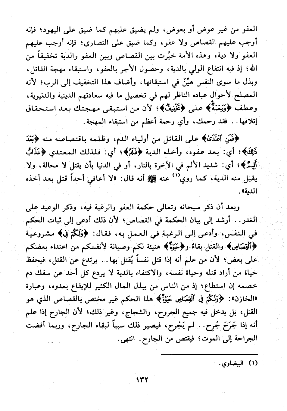 179 - وبعد أن ذكر سبحانه وتعالى حكمة العفو والرغبة فيه، وذكر الوعيد على الغدر .. أرشد إلى بيان الحكمة في القصاص؛ لأن ذلك أدعى إلى ثبات الحكم في النفس، وأدعى إلى الرغبة في العمل به، فقال: {وَلَكُمْ فِي} مشروعية {الْقِصَاصِ} والقتل بقاءٌ و {حَيَاةٌ} هنيئة لكم وصيانة لأنفسكم من اعتداء بعضكم على بعض؛ لأن من علم أنه إذا قتل نفسًا يُقتل بها .. يرتدع عن القتل، فيحفظ حياة من أراد قتله وحياة نفسه، والاكتفاء بالدية لا يردع كل أحد عن سفك دم خصمه إن استطاع؛ إذ من الناس من يبذل المال الكثير للإيقاع بعدوه، وعبارة "الخازن": {وَلَكُمْ فِي الْقِصَاصِ حَيَاةٌ} هذا الحكم غير مختص بالقصاص الذي هو القتل، بل يدخل فيه جميع الجروح، والشجاج، وغير ذلك؛ لأن الجارح إذا علم أنه إذا جَرَحَ جُرِح .. لم يَجْرح، فيصير ذلك سببًا لبقاء الجارح، وربما أفضت الجراحة إلى الموت؛ فيقتص من الجارح. انتهى.