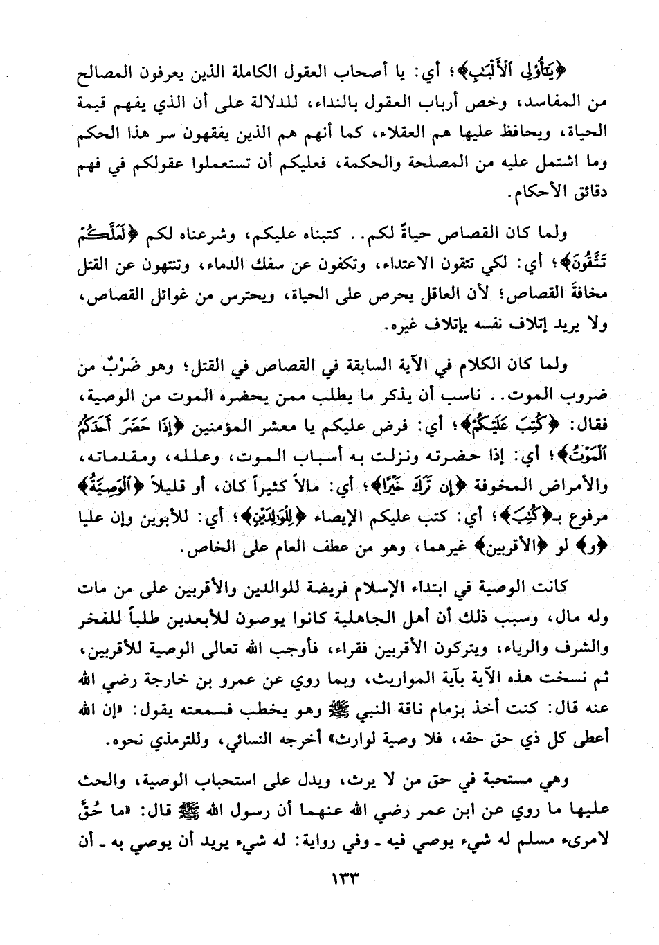 {يَا أُولِي الْأَلْبَابِ}؛ أي: يا أصحاب العقول الكاملة الذين يعرفون المصالح من المفاسد، وخص أرباب العقول بالنداء، للدلالة على أن الذي يفهم قيمة الحياة، ويحافظ عليها هم العقلاء، كما أنهم هم الذين يفقهون سر هذا الحكم وما اشتمل عليه من المصلحة والحكمة، فعليكم أن تستعملوا عقولكم في فهم دقائق الأحكام.