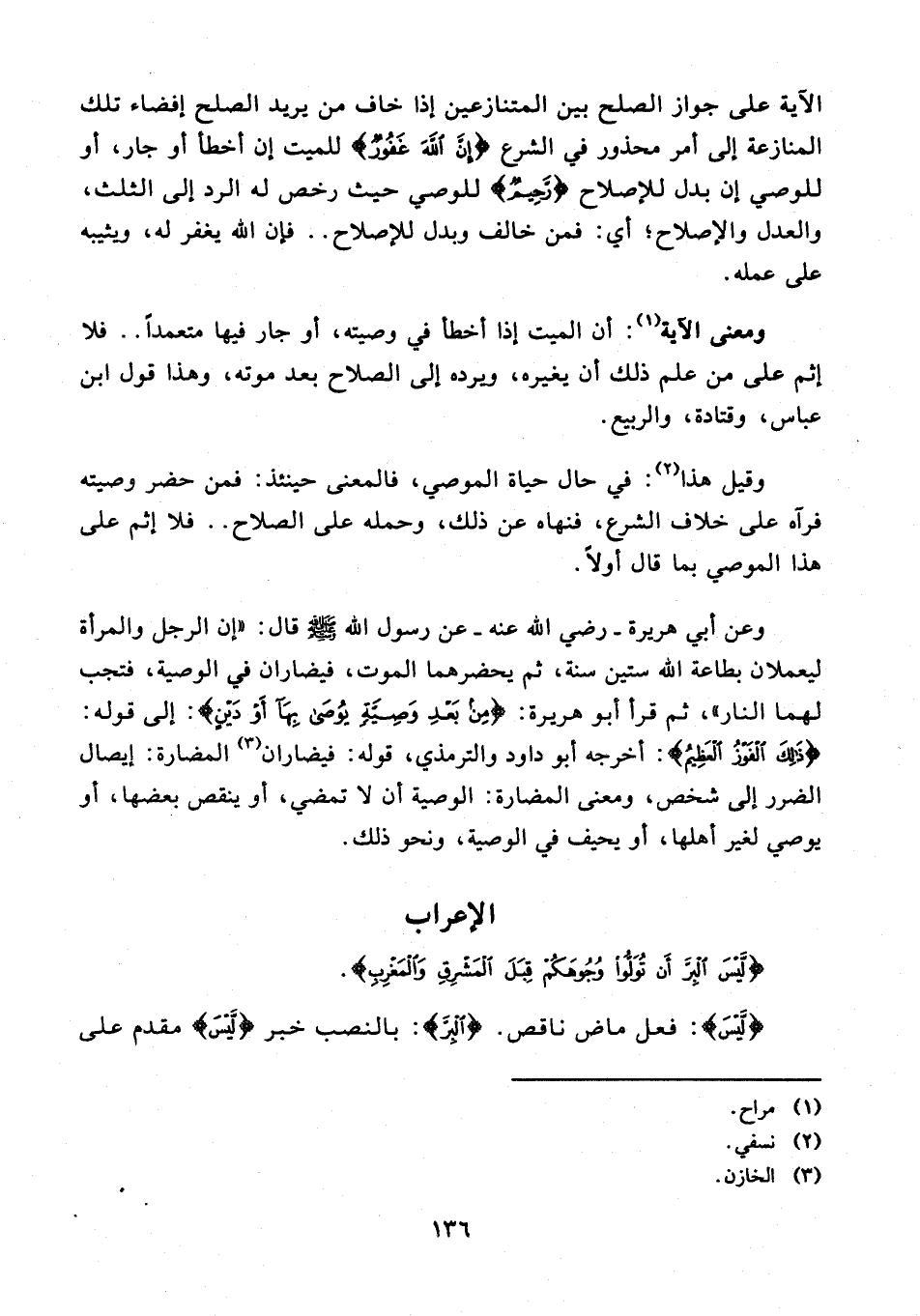 ومعنى الآية (¬1): أن الميت إذا أخطأ في وصيته، أو جار فيها متعمدًا .. فلا إثم على من علم ذلك أن يغيره، ويرده إلى الصلاح بعد موته، وهذا قول ابن عباس، وقتادة، والربيع.