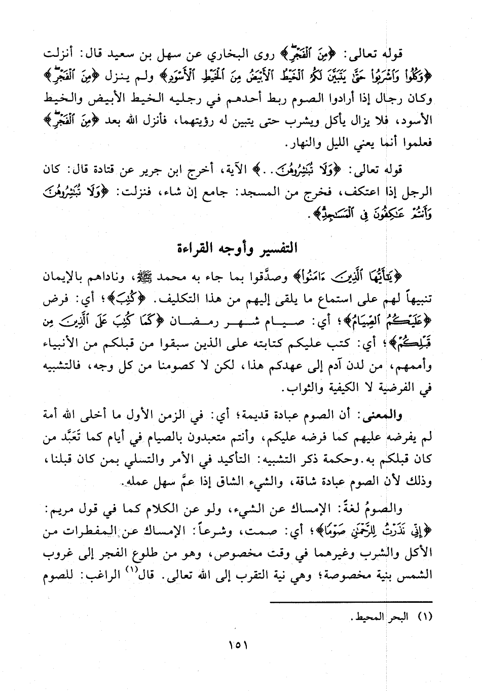 قوله تعالى: {مِنَ الْفَجْرِ} روى البخاري عن سهل بن سعيد قال: أنزلت {وَكُلُوا وَاشْرَبُوا حَتَّى يَتَبَيَّنَ لَكُمُ الْخَيْطُ الْأَبْيَضُ مِنَ الْخَيْطِ الْأَسْوَدِ} ولم ينزل {مِنَ الْفَجْرِ} وكان رجال إذا أرادوا الصوم ربط أحدهم في رجليه الخيط الأبيض والخيط الأسود، فلا يزال يأكل ويشرب حتى يتبين له رؤيتهما، فأنزل الله بعد {مِنَ الْفَجْرِ} فعلموا أنما يعني الليل والنهار.