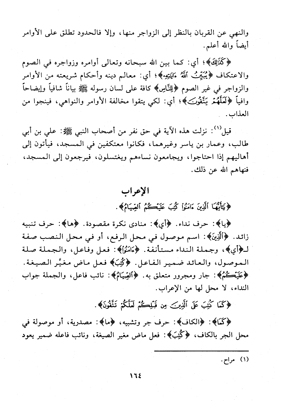 يا: حرف نداء. {أي}: منادى نكرة مقصودة. {ها}: حرف تنبيه زائد. {الَّذِينَ}: اسم موصول في محل الرفع، أو في محل النصب صفة لـ {أي}، وجملة النداء مستأنفة. {آمَنُوا}: فعل وفاعل، والجملة صلة الموصول، والعائد ضمير الفاعل. {كُتِبَ} فعل ماض مغيَّر الصيغة. {عَلَيْكُمُ}: جار ومجرور متعلق به. {الصِّيَامُ}: نائب فاعل، والجملة جواب النداء، لا محل لها من الإعراب.