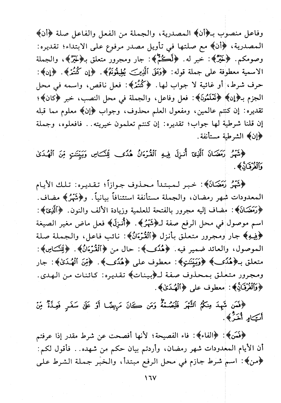 {شَهْرُ رَمَضَانَ}: خبر لمبتدأ محذوف جوازًا؛ تقديره: تلك الأيام المعدودات شهر رمضان، والجملة مستأنفة استئنافًا بيانيًّا. و {شَهْرُ} مضاف. {رَمَضَانَ}: مضاف إليه مجرور بالفتحة للعلمية وزيادة الألف والنون. {الَّذِي}: اسم موصول في محل الرفع صفة لـ {شَهْرُ}. {أُنْزِلَ} فعل ماض مغير الصيغة {فِيهِ} جار ومجرور متعلق بأنزل {الْقُرْآنُ}: نائب فاعل، والجملة صلة الموصول، والعائد ضمير فيه. {هُدًى}: حال من {الْقُرْآنُ}. {لِلنَّاسِ}: متعلق بـ {هُدًى} {وَبَيِّنَاتٍ}: معطوف على {هُدًى}. {مِنَ الْهُدَى}: جار ومجرور متعلق بمحذوف صفة لـ {بينات} تقديره: كائنات من الهدى. {وَالْفُرْقَانِ}: معطوف على {الْهُدَى}.