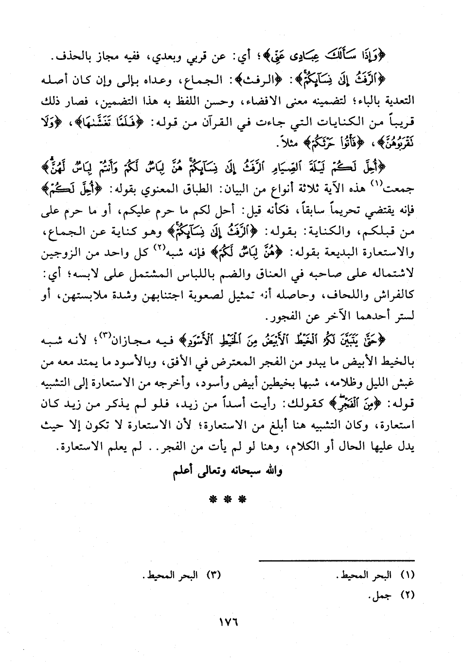 جمعت (¬1) هذه الآية ثلاثة أنواع من البيان: الطباق المعنوي بقوله: {أُحِلَّ لَكُمْ} فإنه يقتضي تحريمًا سابقًا، فكأنه قيل: أحل لكم ما حرم عليكم، أو ما حرم على من قبلكم، والكناية: بقوله: {الرَّفَثُ إِلَى نِسَائِكُمْ} وهو كناية عن الجماع، والاستعارة البديعة بقوله: {هُنَّ لِبَاسٌ لَكُمْ} فإنه شبه (¬2) كل واحد من الزوجين لاشتماله على صاحبه في العناق والضم باللباس المشتمل على لابسه؛ أي: كالفراش واللحاف، وحاصله أنه تمثيل لصعوبة اجتنابهن وشدة ملابستهن، أو لستر أحدهما الآخر عن الفجور.