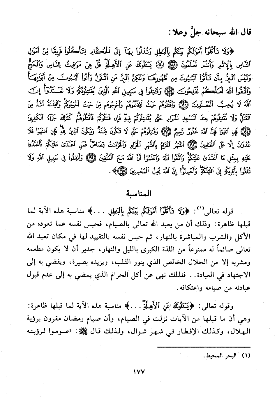 {وَلَا تَأْكُلُوا أَمْوَالَكُمْ بَيْنَكُمْ بِالْبَاطِلِ وَتُدْلُوا بِهَا إِلَى الْحُكَّامِ لِتَأْكُلُوا فَرِيقًا مِنْ أَمْوَالِ النَّاسِ بِالْإِثْمِ وَأَنْتُمْ تَعْلَمُونَ (188) يَسْأَلُونَكَ عَنِ الْأَهِلَّةِ قُلْ هِيَ مَوَاقِيتُ لِلنَّاسِ وَالْحَجِّ وَلَيْسَ الْبِرُّ بِأَنْ تَأْتُوا الْبُيُوتَ مِنْ ظُهُورِهَا وَلَكِنَّ الْبِرَّ مَنِ اتَّقَى وَأْتُوا الْبُيُوتَ مِنْ أَبْوَابِهَا وَاتَّقُوا اللَّهَ لَعَلَّكُمْ تُفْلِحُونَ (189) وَقَاتِلُوا فِي سَبِيلِ اللَّهِ الَّذِينَ يُقَاتِلُونَكُمْ وَلَا تَعْتَدُوا إِنَّ اللَّهَ لَا يُحِبُّ الْمُعْتَدِينَ (190) وَاقْتُلُوهُمْ حَيْثُ ثَقِفْتُمُوهُمْ وَأَخْرِجُوهُمْ مِنْ حَيْثُ أَخْرَجُوكُمْ وَالْفِتْنَةُ أَشَدُّ مِنَ الْقَتْلِ وَلَا تُقَاتِلُوهُمْ عِنْدَ الْمَسْجِدِ الْحَرَامِ حَتَّى يُقَاتِلُوكُمْ فِيهِ فَإِنْ قَاتَلُوكُمْ فَاقْتُلُوهُمْ كَذَلِكَ جَزَاءُ الْكَافِرِينَ (191) فَإِنِ انْتَهَوْا فَإِنَّ اللَّهَ غَفُورٌ رَحِيمٌ (192) وَقَاتِلُوهُمْ حَتَّى لَا تَكُونَ فِتْنَةٌ وَيَكُونَ الدِّينُ لِلَّهِ فَإِنِ انْتَهَوْا فَلَا عُدْوَانَ إِلَّا عَلَى الظَّالِمِينَ (193) الشَّهْرُ الْحَرَامُ بِالشَّهْرِ الْحَرَامِ وَالْحُرُمَاتُ قِصَاصٌ فَمَنِ اعْتَدَى عَلَيْكُمْ فَاعْتَدُوا عَلَيْهِ بِمِثْلِ مَا اعْتَدَى عَلَيْكُمْ وَاتَّقُوا اللَّهَ وَاعْلَمُوا أَنَّ اللَّهَ مَعَ الْمُتَّقِينَ (194) وَأَنْفِقُوا فِي سَبِيلِ اللَّهِ وَلَا تُلْقُوا بِأَيْدِيكُمْ إِلَى التَّهْلُكَةِ وَأَحْسِنُوا إِنَّ اللَّهَ يُحِبُّ الْمُحْسِنِينَ (195)}.