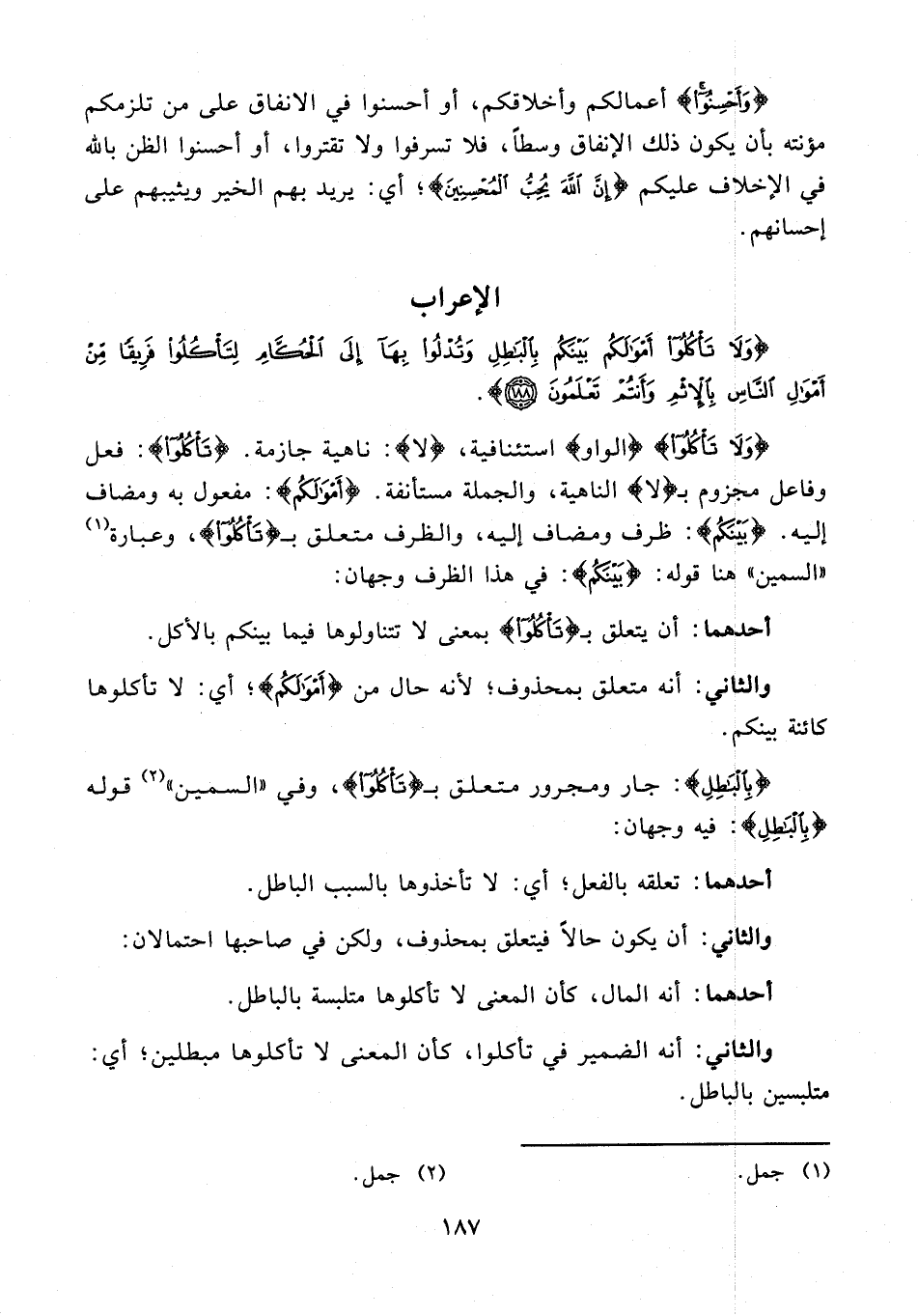 {وَلَا تَأْكُلُوا} {الواو} استئنافية، {لا}: ناهية جازمة. {تَأْكُلُوا}: فعل وفاعل مجزوم بـ {لا} الناهية، والجملة مستأنفة. {أَمْوَالَكُمْ}: مفعول به ومضاف إليه. {بَيْنَكُمْ}: ظرف ومضاف إليه، والظرف متعلق بـ {تَأْكُلُوا}، وعبارة (¬1) "السمين" هنا قوله: {بَيْنَكُمْ}: في هذا الظرف وجهان: