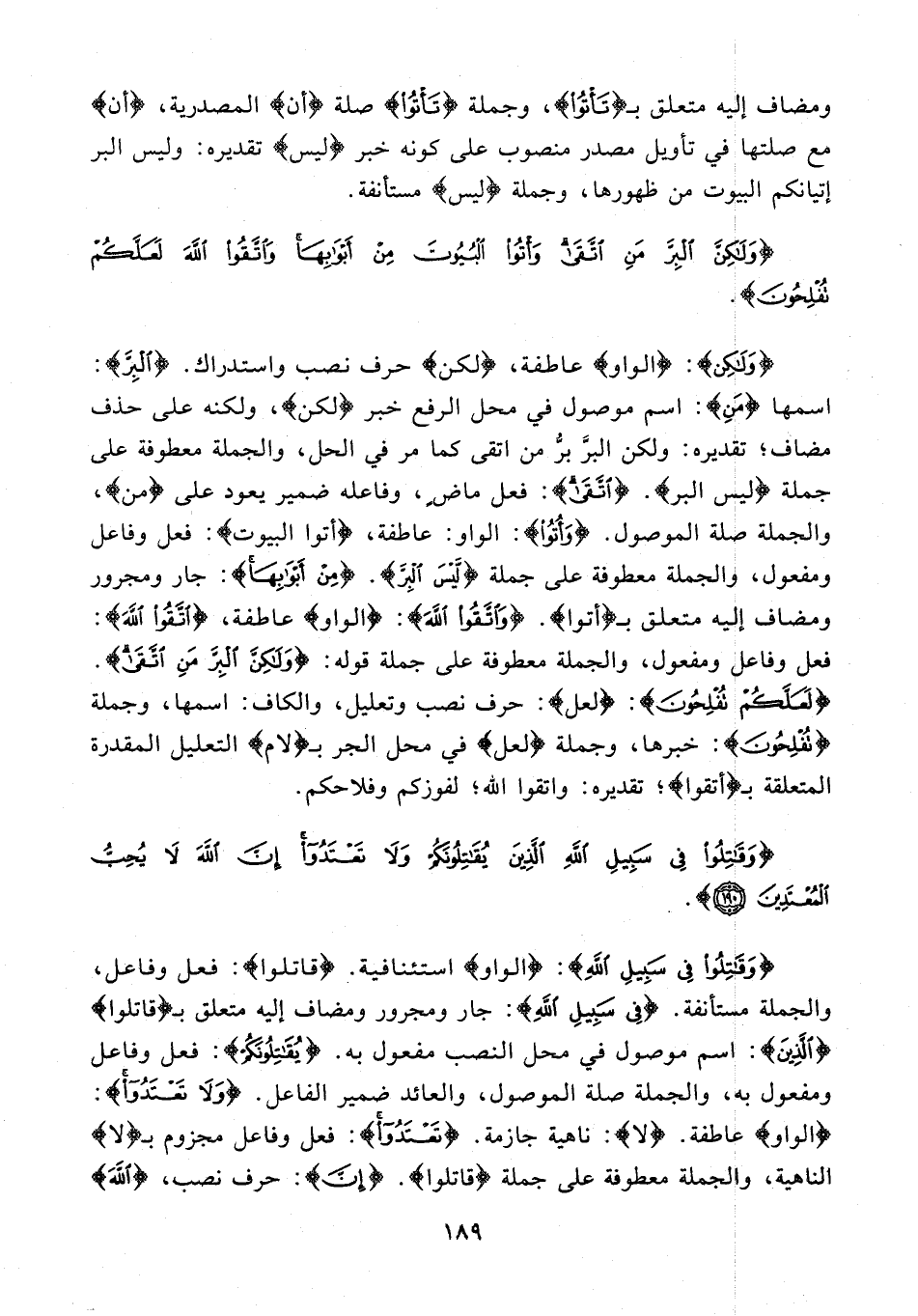 {وَلَكِنَّ}: {الواو} عاطفة، {لكن} حرف نصب واستدراك. {الْبِرَّ}: اسمها {مَنِ}: اسم موصول في محل الرفع خبر {لكن}، ولكنه على حذف مضاف؛ تقديره: ولكن البرَّ برُّ من اتقى كما مر في الحل، والجملة معطوفة على جملة {ليس البر}. {اتَّقَى}: فعل ماضٍ، وفاعله ضمير يعود على {من}، والجملة صلة الموصول. {وَأْتُوا}: الواو: عاطفة، {أتوا البيوت}: فعل وفاعل ومفعول، والجملة معطوفة على جملة {وَلَيْسَ الْبِرُّ}. {مِنْ أَبْوَابِهَا}: جار ومجرور ومضاف إليه متعلق بـ {أتوا}. {وَاتَّقُوا اللَّهَ}: {الواو} عاطفة، {اتَّقُوا اللَّهَ}: فعل وفاعل ومفعول، والجملة معطوفة على جملة قوله: {وَلَكِنَّ الْبِرَّ مَنِ اتَّقَى}. {لَعَلَّكُمْ تُفْلِحُونَ}: {لعل}: حرف نصب وتعليل، والكاف: اسمها، وجملة {تُفْلِحُونَ}: خبرها، وجملة {لعل} في محل الجر بـ {لام} التعليل المقدرة المتعلقة بـ {اتقوا}؛ تقديره: واتقوا الله؛ لفوزكم وفلاحكم.
