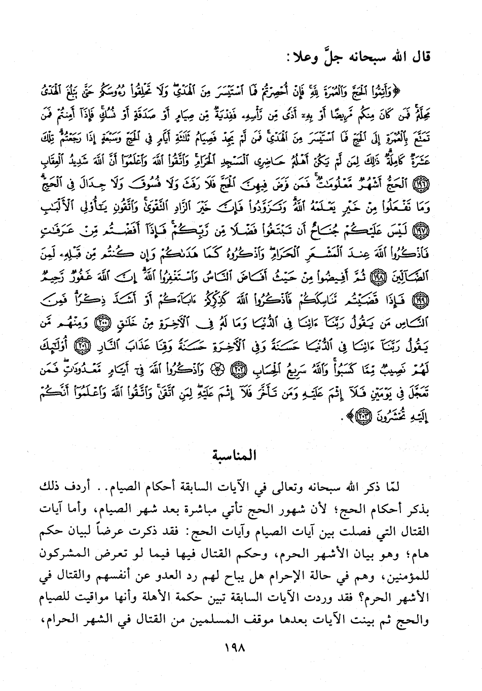 {وَأَتِمُّوا الْحَجَّ وَالْعُمْرَةَ لِلَّهِ فَإِنْ أُحْصِرْتُمْ فَمَا اسْتَيْسَرَ مِنَ الْهَدْيِ وَلَا تَحْلِقُوا رُءُوسَكُمْ حَتَّى يَبْلُغَ الْهَدْيُ مَحِلَّهُ فَمَنْ كَانَ مِنْكُمْ مَرِيضًا أَوْ بِهِ أَذًى مِنْ رَأْسِهِ فَفِدْيَةٌ مِنْ صِيَامٍ أَوْ صَدَقَةٍ أَوْ نُسُكٍ فَإِذَا أَمِنْتُمْ فَمَنْ تَمَتَّعَ بِالْعُمْرَةِ إِلَى الْحَجِّ فَمَا اسْتَيْسَرَ مِنَ الْهَدْيِ فَمَنْ لَمْ يَجِدْ فَصِيَامُ ثَلَاثَةِ أَيَّامٍ فِي الْحَجِّ وَسَبْعَةٍ إِذَا رَجَعْتُمْ تِلْكَ عَشَرَةٌ كَامِلَةٌ ذَلِكَ لِمَنْ لَمْ يَكُنْ أَهْلُهُ حَاضِرِي الْمَسْجِدِ الْحَرَامِ وَاتَّقُوا اللَّهَ وَاعْلَمُوا أَنَّ اللَّهَ شَدِيدُ الْعِقَابِ (196) الْحَجُّ أَشْهُرٌ مَعْلُومَاتٌ فَمَنْ فَرَضَ فِيهِنَّ الْحَجَّ فَلَا رَفَثَ وَلَا فُسُوقَ وَلَا جِدَالَ فِي الْحَجِّ وَمَا تَفْعَلُوا مِنْ خَيْرٍ يَعْلَمْهُ اللَّهُ وَتَزَوَّدُوا فَإِنَّ خَيْرَ الزَّادِ التَّقْوَى وَاتَّقُونِ يَا أُولِي الْأَلْبَابِ (197) لَيْسَ عَلَيْكُمْ جُنَاحٌ أَنْ تَبْتَغُوا فَضْلًا مِنْ رَبِّكُمْ فَإِذَا أَفَضْتُمْ مِنْ عَرَفَاتٍ فَاذْكُرُوا اللَّهَ عِنْدَ الْمَشْعَرِ الْحَرَامِ وَاذْكُرُوهُ كَمَا هَدَاكُمْ وَإِنْ كُنْتُمْ مِنْ قَبْلِهِ لَمِنَ الضَّالِّينَ (198) ثُمَّ أَفِيضُوا مِنْ حَيْثُ أَفَاضَ النَّاسُ وَاسْتَغْفِرُوا اللَّهَ إِنَّ اللَّهَ غَفُورٌ رَحِيمٌ (199) فَإِذَا قَضَيْتُمْ مَنَاسِكَكُمْ فَاذْكُرُوا اللَّهَ كَذِكْرِكُمْ آبَاءَكُمْ أَوْ أَشَدَّ ذِكْرًا فَمِنَ النَّاسِ مَنْ يَقُولُ رَبَّنَا آتِنَا فِي الدُّنْيَا وَمَا لَهُ فِي الْآخِرَةِ مِنْ خَلَاقٍ (200) وَمِنْهُمْ مَنْ يَقُولُ رَبَّنَا آتِنَا فِي الدُّنْيَا حَسَنَةً وَفِي الْآخِرَةِ حَسَنَةً وَقِنَا عَذَابَ النَّارِ (201) أُولَئِكَ لَهُمْ نَصِيبٌ مِمَّا كَسَبُوا وَاللَّهُ سَرِيعُ الْحِسَابِ (202) وَاذْكُرُوا اللَّهَ فِي أَيَّامٍ مَعْدُودَاتٍ فَمَنْ تَعَجَّلَ فِي يَوْمَيْنِ فَلَا إِثْمَ عَلَيْهِ وَمَنْ تَأَخَّرَ فَلَا إِثْمَ عَلَيْهِ لِمَنِ اتَّقَى وَاتَّقُوا اللَّهَ وَاعْلَمُوا أَنَّكُمْ إِلَيْهِ تُحْشَرُونَ (203)}.