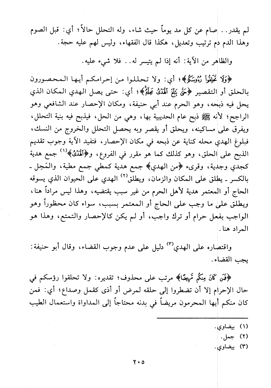 {وَلَا تَحْلِقُوا رُءُوسَكُمْ}؛ أي: ولا تحللوا من إحرامكم أيها المحصورون بالحلق أو التقصير {حَتَّى يَبْلُغَ الْهَدْيُ مَحِلَّهُ}؛ أي: حتى يصل الهدي المكان الذي يحل فيه ذبحه، وهو الحرم عند أبي حنيفة، ومكان الإحصار عند الشافعي وهو الراجح؛ لأنه - صلى الله عليه وسلم - ذبح عام الحديبية بها، وهي من الحل، فيذبح فيه بنية التحلل، ويفرق على مساكينه، ويحلق أو يقصر وبه يحصل التحلل والخروج من النسك، فبلوغ الهدي محله كناية عن ذبحه في مكان الإحصار، فتفيد الآية وجوب تقديم الذبح على الحلق، وهو كذلك كما هو مقرر في الفروع، و {الْهَدْيُ} (¬1) جمع هدية كجدي وجدية، وقرىء {من الهدي} جمع هدية كمطي جمع مطية، والمَحِل - بالكسر - يطلق على المكان والزمان، ويطلق (¬2) الهدي على الحيوان الذي يسوقه الحاج أو المعتمر هدية لأهل الحرم من غير سبب يقتضيه، وهذا ليس مرادًا هنا، ويطلق على ما وجب على الحاج أو المعتمر بسبب، سواء كان محظورًا وهو الواجب بفعل حرام أو ترك واجب، أو لم يكن كالإحصار والتمتع، وهذا هو المراد هنا.