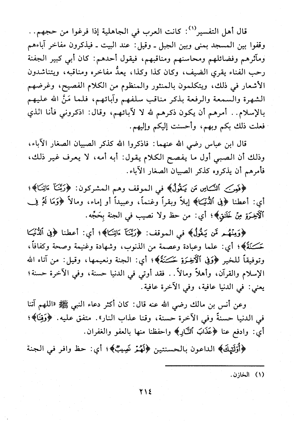 وعن أنس بن مالك رضي الله عنه قال: كان أكثر دعاء النبي - صلى الله عليه وسلم - "اللهم آتنا في الدنيا حسنةً وفي الآخرة حسنة، وقنا عذاب النار". متفق عليه. {وَقِنَا}؛ أي: وادفع عنا {عَذَابَ النَّارِ} واحفظنا منها بالعفو والغفران.