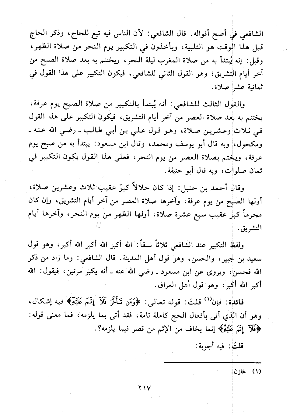 الشافعي في أصح أقواله. قال الشافعي: لأن الناس فيه تبع للحاج، وذكر الحاج قبل هذا الوقت هو التلبية، ويأخذون في التكبير يوم النحر من صلاة الظهر، وقيل: إنه يُبتدأ به من صلاة المغرب ليلة النحر، ويختتم به بعد صلاة الصبح من آخر أيام التشريق؛ وهو القول الثاني للشافعي، فيكون التكبير على هذا القول في ثمانية عشر صلاة.