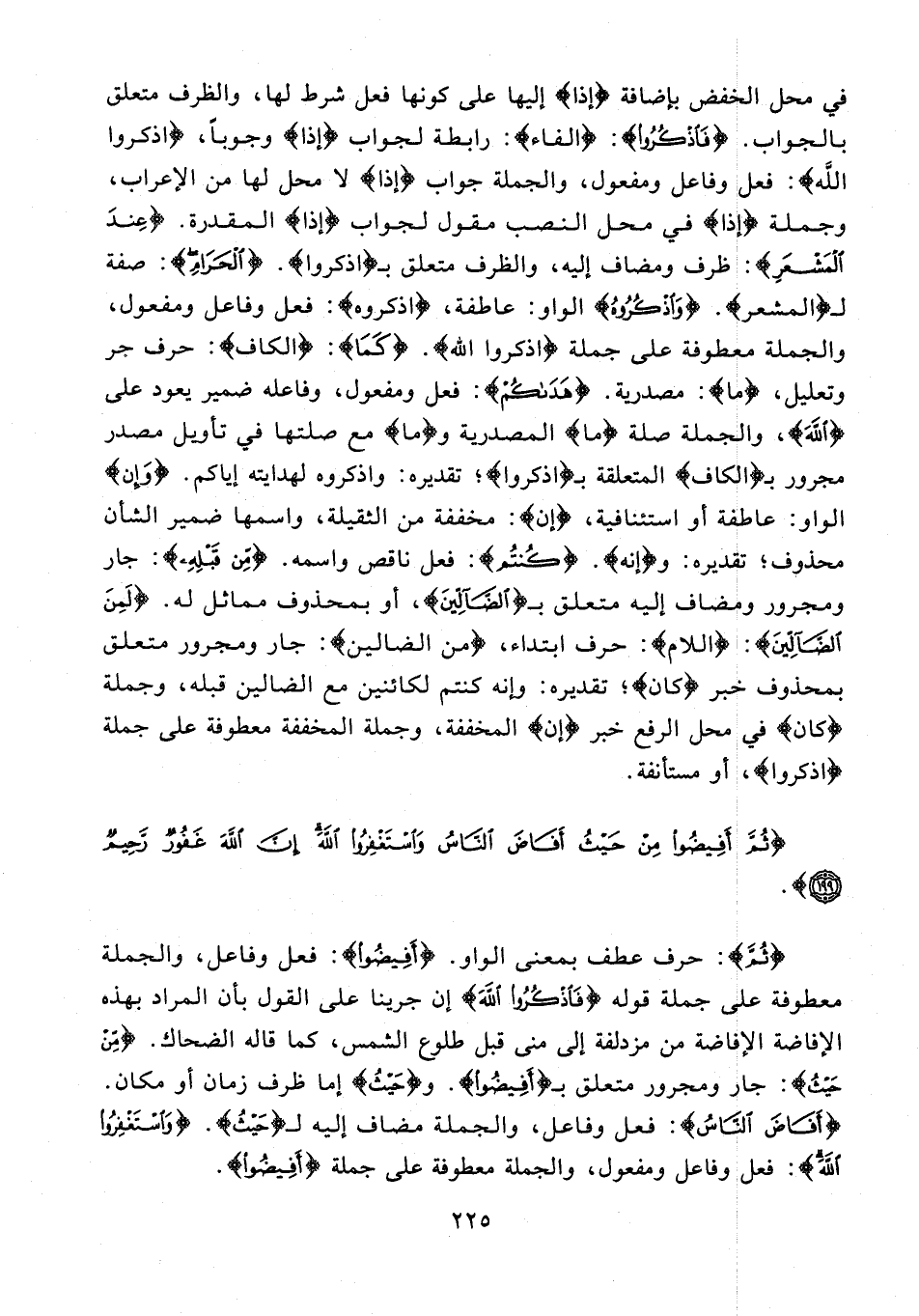 {ثُمَّ}: حرف عطف بمعنى الواو. {أَفِيضُوا}: فعل وفاعل، والجملة معطوفة على جملة قوله {فَاذْكُرُوا اللَّهَ} إن جرينا على القول بأن المراد بهذه الإفاضة الإفاضة من مزدلفة إلى منى قبل طلوع الشمس، كما قاله الضحاك. {مَنْ يَقُولُ}: جار ومجرور متعلق بـ {أَفِيضُوا}. و {حَيْثُ} إما ظرف زمان أو مكان. {أَفَاضَ النَّاسُ}: فعل وفاعل، والجملة مضاف إليه لـ {حَيْثُ}. {وَاسْتَغْفِرُوا اللَّهَ}: فعل وفاعل ومفعول، والجملة معطوفة على جملة {أَفِيضُوا}.