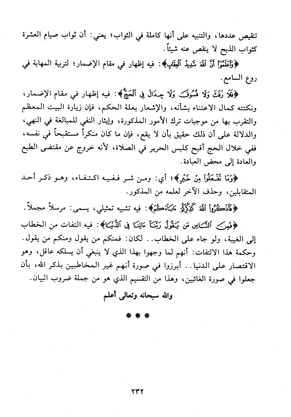 {فَلَا رَفَثَ وَلَا فُسُوقَ وَلَا جِدَالَ فِي الْحَجِّ}: فيه إظهار في مقام الإضمار، ونكتته كمال الاعتناء بشأنه، والإشعار بعلة الحكم، فإن زيارة البيت المعظم والتقرب بها من موجبات ترك الأمور المذكورة، وإيثار النفي للمبالغة في النهي، والدلالة على أن ذلك حقيق بأن لا يقع، فإن ما كان منكرًا مستقبحًا في نفسه، ففي خلال الحج أقبح كلبس الحرير في الصلاة؛ لأنه خروج عن مقتضى الطبع والعادة إلى محض العبادة.