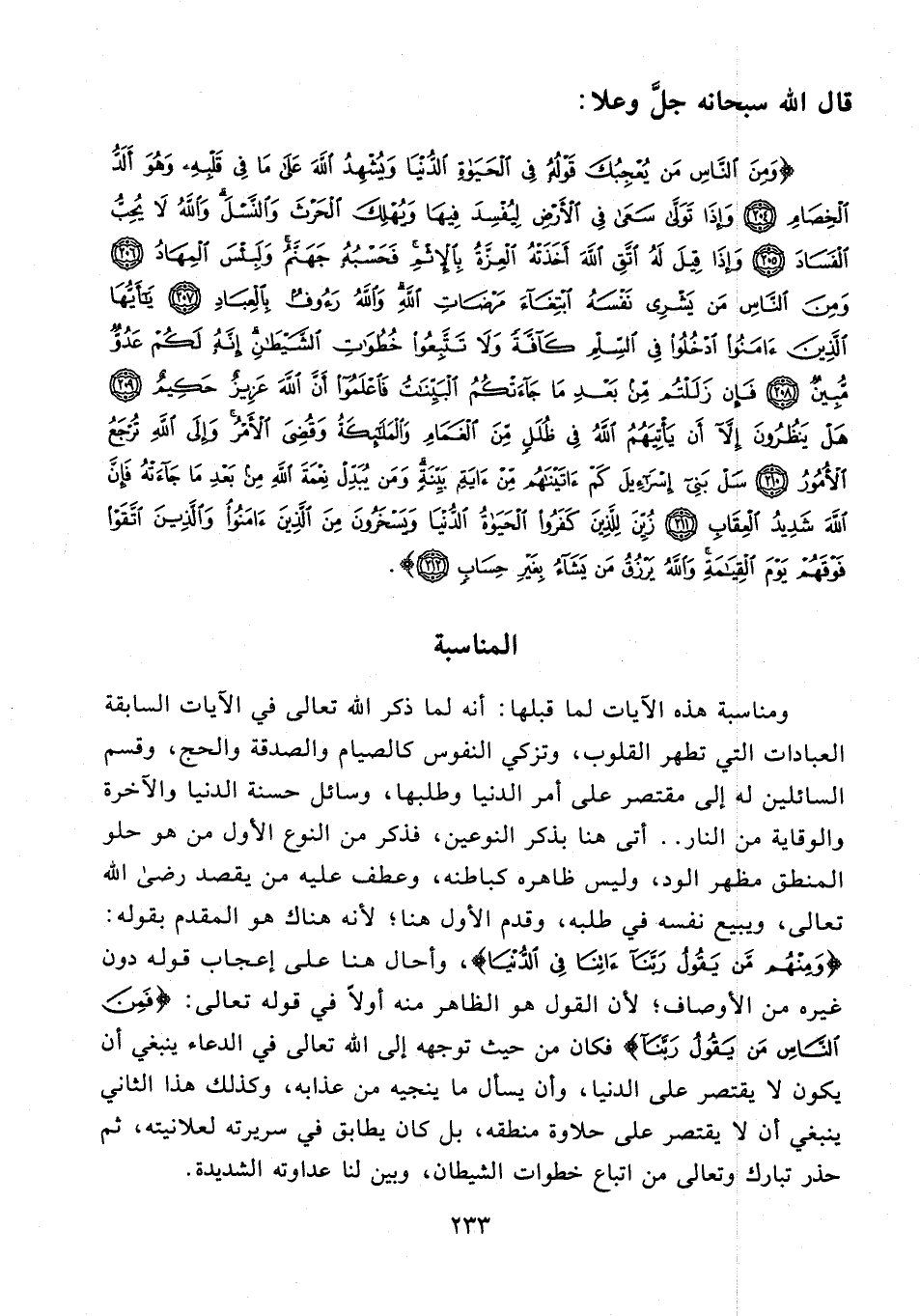 {وَمِنَ النَّاسِ مَنْ يُعْجِبُكَ قَوْلُهُ فِي الْحَيَاةِ الدُّنْيَا وَيُشْهِدُ اللَّهَ عَلَى مَا فِي قَلْبِهِ وَهُوَ أَلَدُّ الْخِصَامِ (204) وَإِذَا تَوَلَّى سَعَى فِي الْأَرْضِ لِيُفْسِدَ فِيهَا وَيُهْلِكَ الْحَرْثَ وَالنَّسْلَ وَاللَّهُ لَا يُحِبُّ الْفَسَادَ (205) وَإِذَا قِيلَ لَهُ اتَّقِ اللَّهَ أَخَذَتْهُ الْعِزَّةُ بِالْإِثْمِ فَحَسْبُهُ جَهَنَّمُ وَلَبِئْسَ الْمِهَادُ (206) وَمِنَ النَّاسِ مَنْ يَشْرِي نَفْسَهُ ابْتِغَاءَ مَرْضَاتِ اللَّهِ وَاللَّهُ رَءُوفٌ بِالْعِبَادِ (207) يَا أَيُّهَا الَّذِينَ آمَنُوا ادْخُلُوا فِي السِّلْمِ كَافَّةً وَلَا تَتَّبِعُوا خُطُوَاتِ الشَّيْطَانِ إِنَّهُ لَكُمْ عَدُوٌّ مُبِينٌ (208) فَإِنْ زَلَلْتُمْ مِنْ بَعْدِ مَا جَاءَتْكُمُ الْبَيِّنَاتُ فَاعْلَمُوا أَنَّ اللَّهَ عَزِيزٌ حَكِيمٌ (209) هَلْ يَنْظُرُونَ إِلَّا أَنْ يَأْتِيَهُمُ اللَّهُ فِي ظُلَلٍ مِنَ الْغَمَامِ وَالْمَلَائِكَةُ وَقُضِيَ الْأَمْرُ وَإِلَى اللَّهِ تُرْجَعُ الْأُمُورُ (210) سَلْ بَنِي إِسْرَائِيلَ كَمْ آتَيْنَاهُمْ مِنْ آيَةٍ بَيِّنَةٍ وَمَنْ يُبَدِّلْ نِعْمَةَ اللَّهِ مِنْ بَعْدِ مَا جَاءَتْهُ فَإِنَّ اللَّهَ شَدِيدُ الْعِقَابِ (211) زُيِّنَ لِلَّذِينَ كَفَرُوا الْحَيَاةُ الدُّنْيَا وَيَسْخَرُونَ مِنَ الَّذِينَ آمَنُوا وَالَّذِينَ اتَّقَوْا فَوْقَهُمْ يَوْمَ الْقِيَامَةِ وَاللَّهُ يَرْزُقُ مَنْ يَشَاءُ بِغَيْرِ حِسَابٍ (212)}.