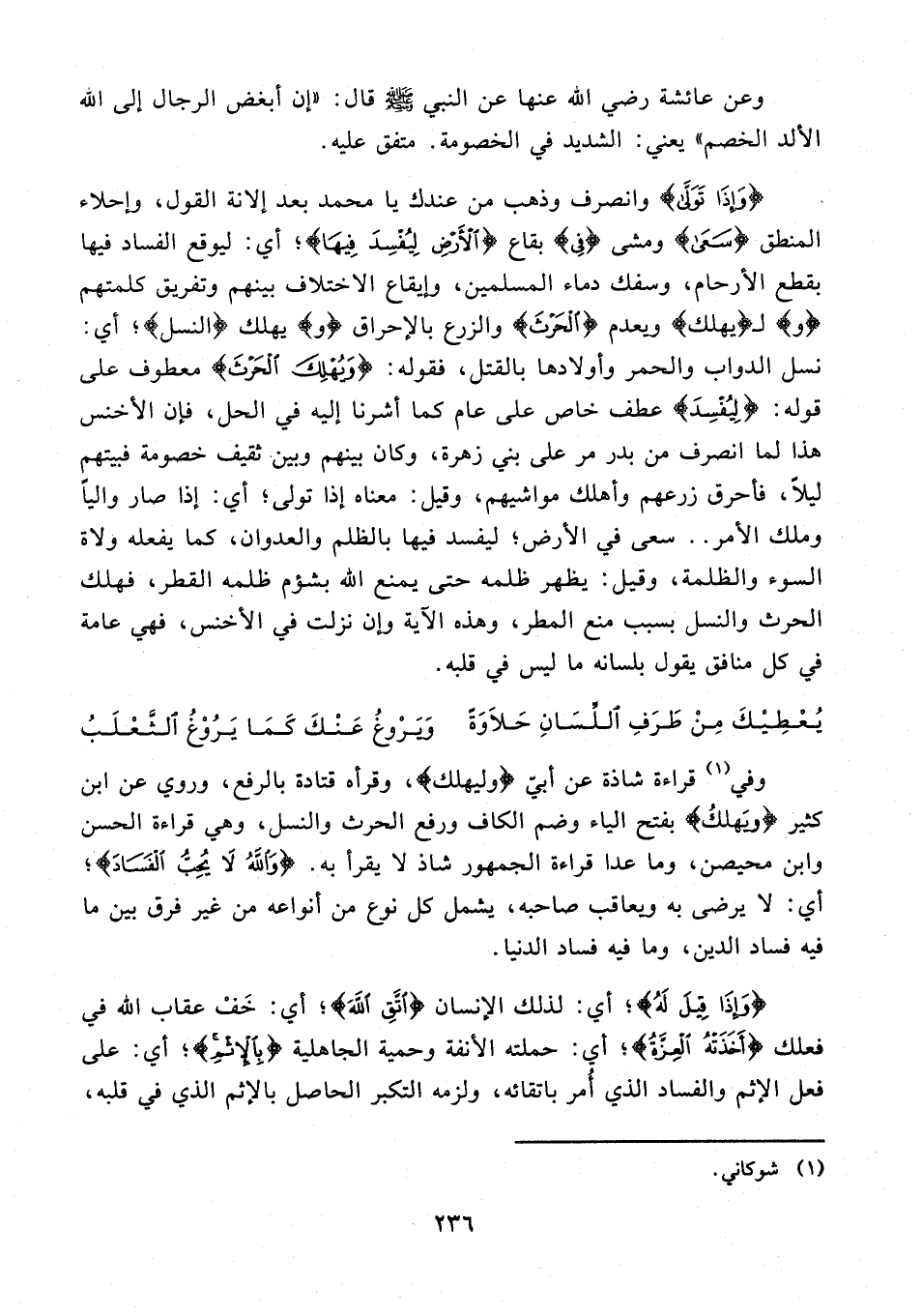 205 - {وَإِذَا تَوَلَّى} وانصرف وذهب من عندك يا محمَّد بعد إلانة القول، وإحلاء المنطق {سَعَى} ومشى {في} بقاع {الْأَرْضِ لِيُفْسِدَ فِيهَا}؛ أي: ليوقع الفساد فيها بقطع الأرحام، وسفك دماء المسلمين، وإيقاع الاختلاف بينهم وتفريق كلمتهم {و} لـ {يهلك} ويعدم {الْحَرْثَ} والزرع بالإحراق {و} يهلك {النسل}؛ أي: نسل الدواب والحمر وأولادها بالقتل، فقوله: {وَيُهْلِكَ الْحَرْثَ} معطوف على قوله: {لِيُفْسِدَ} عطف خاص على عام كما أشرنا إليه في الحل، فإن الأخنس هذا لما انصرف من بدر مر على بني زهرة، وكان بينهم وبين ثقيف خصومة فبيتهم ليلًا، فأحرق زرعهم وأهلك مواشيهم، وقيل: معناه إذا تولى؛ أي: إذا صار واليًا وملك الأمر .. سعى في الأرض؛ ليفسد فيها بالظلم والعدوان، كما يفعله ولاة السوء والظلمة، وقيل: يظهر ظلمه حتى يمنع الله بشؤم ظلمه القطر، فهلك الحرث والنسل بسبب منع المطر، وهذه الآية وإن نزلت في الأخنس، فهي عامة في كل منافق يقول بلسانه ما ليس في قلبه.