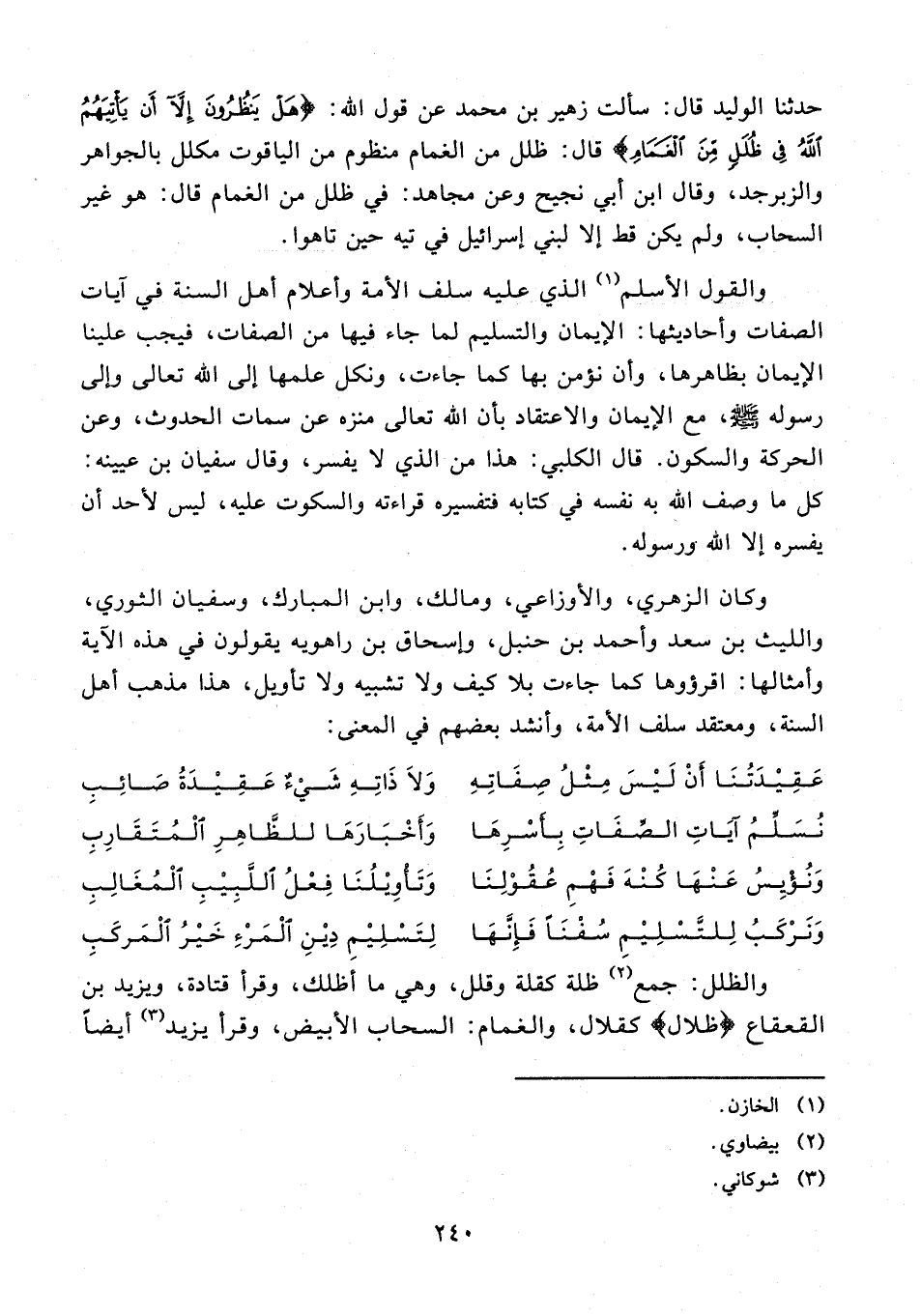 وكان الزهري، والأوزاعي، ومالك، وابن المبارك، وسفيان الثوري، والليث بن سعد وأحمد بن حنبل، وإسحاق بن راهويه يقولون في هذه الآية وأمثالها: اقرؤوها كما جاءت بلا كيف ولا تشبيه ولا تأويل، هذا مذهب أهل السنة، ومعتقد سلف الأمة، وأنشد بعضهم في المعنى: