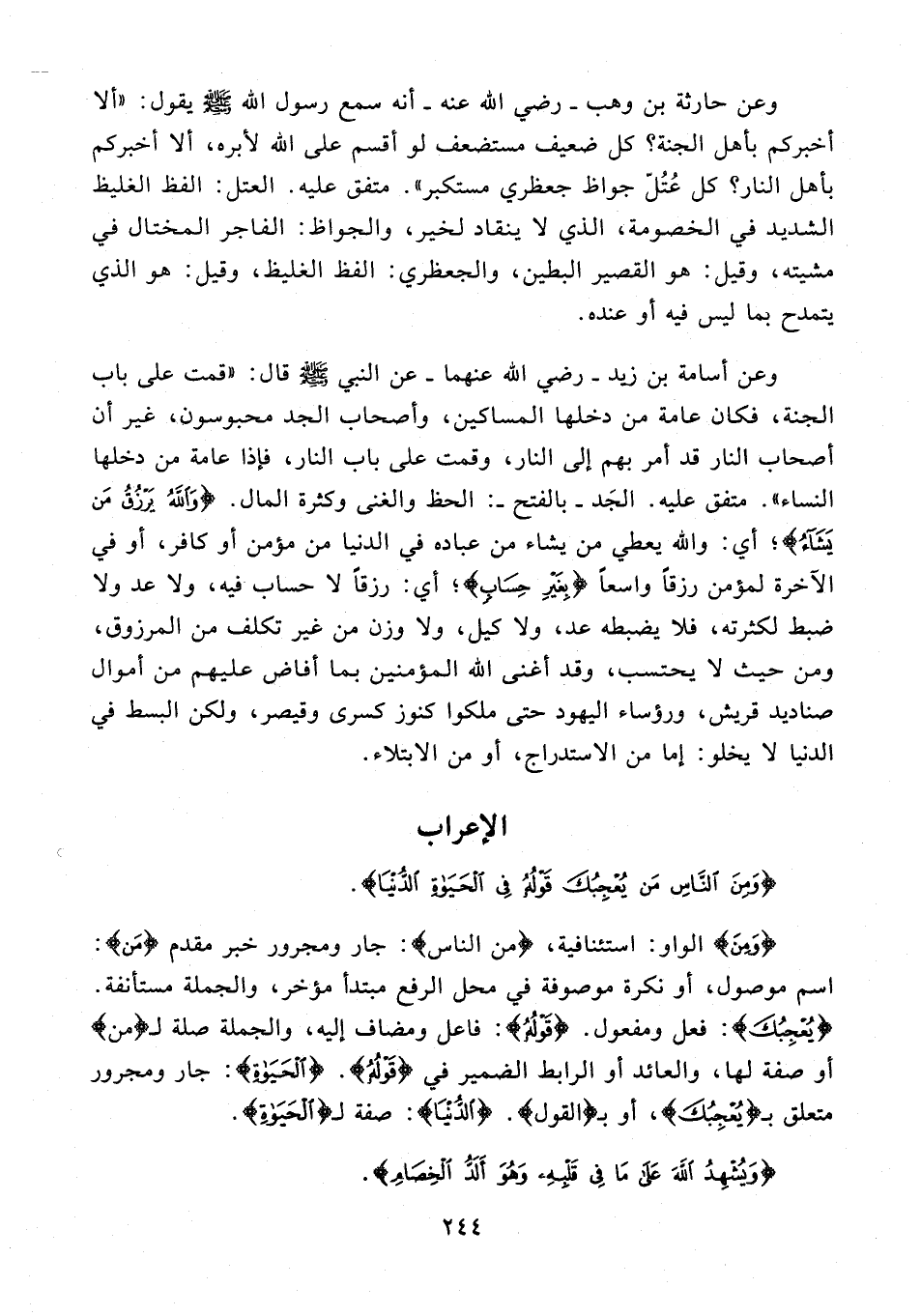 {وَمِنَ} الواو: استئنافية، {من الناس}: جار ومجرور خبر مقدم {مَن}: اسم موصول، أو نكرة موصوفة في محل الرفع مبتدأ مؤخر، والجملة مستأنفة. {يُعْجِبُكَ}: فعل ومفعول. {قَوْلُهُ}: فاعل ومضاف إليه، والجملة صلة لـ {من} أو صفة لها، والعائد أو الرابط الضمير في {قَوْلُهُ}. {الْحَيَاةِ}: جار ومجرور متعلق بـ {يُعْجِبُكَ}، أو بـ {القول}. {الدُّنْيَا}: صفة لـ {الْحَيَاةِ}.