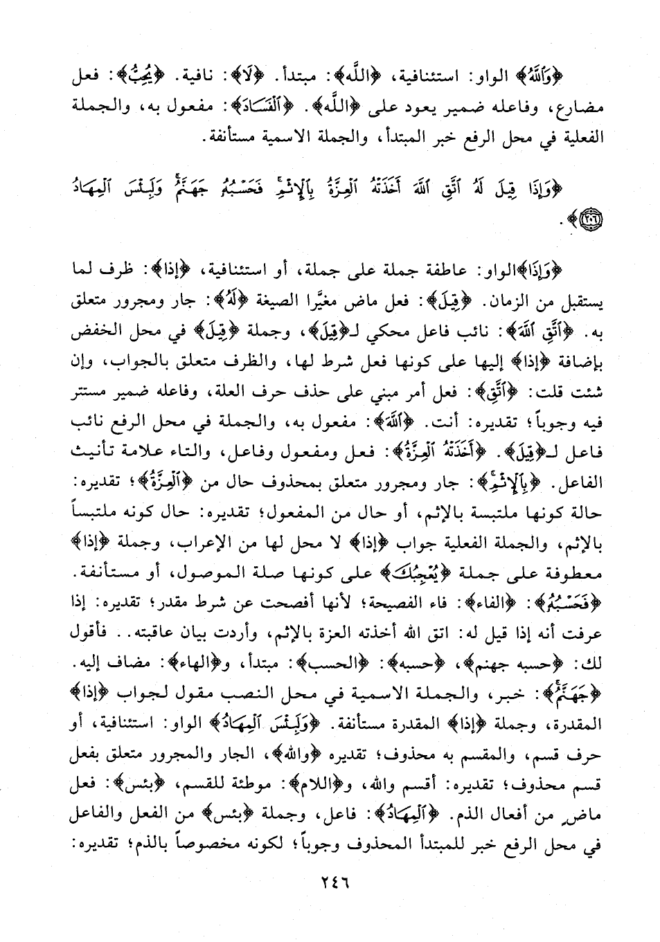 {وَإِذَا} الواو: عاطفة جملة على جملة، أو استئنافية، {إذا}: ظرف لما يستقبل من الزمان. {قِيلَ}: فعل ماض مغيَّرا الصيغة {لَهُ}: جار ومجرور متعلق به. {اتَّقِ اللَّهَ}: نائب فاعل محكي لـ {قِيلَ}، وجملة {قِيلَ} في محل الخفض بإضافة {إذا} إليها على كونها فعل شرط لها، والظرف متعلق بالجواب، وإن شئت قلت: {اتَّقِ}: فعل أمر مبني على حذف حرف العلة، وفاعله ضمير مستتر فيه وجوبًا؛ تقديره: أنت. {اللَّهَ}: مفعول به، والجملة في محل الرفع نائب فاعل لـ {قِيلَ}. {أَخَذَتْهُ الْعِزَّةُ}: فعل ومفعول وفاعل، والتاء علامة تأنيث الفاعل. {بِالْإِثْمِ}: جار ومجرور متعلق بمحذوف حال من {الْعِزَّةُ}؛ تقديره: حالة كونها ملتبسة بالإثم، أو حال من المفعول؛ تقديره: حال كونه ملتبسًا بالإثم، والجملة الفعلية جواب {إذا} لا محل لها من الإعراب، وجملة {إذا} معطوفة على جملة {يُعْجِبُكَ} على كونها صلة الموصول، أو مستأنفة. {فَحَسْبُهُ}: {الفاء}: فاء الفصيحة؛ لأنها أفصحت عن شرط مقدر؛ تقديره: إذا عرفت أنه إذا قيل له: اتق الله أخذته العزة بالإثم، وأردت بيان عاقبته .. فأقول لك: {حسبه جهنم}، {حسبه}: {الحسب}: مبتدأ، و {الهاء}: مضاف إليه. {جَهَنَّمُ}: خبر، والجملة الإسمية في محل النصب مقول لجواب {إذا} المقدرة، وجملة {إذا} المقدرة مستأنفة. {وَلَبِئْسَ الْمِهَادُ} الواو: استئنافية، أو حرف قسم، والمقسم به محذوف؛ تقديره {والله}، الجار والمجرور متعلق بفعل قسم محذوف؛ تقديره: أقسم والله، و {اللام}: موطئة للقسم، {بئس}: فعل ماضٍ من أفعال الذم. {الْمِهَادُ}: فاعل، وجملة {بئس} من الفعل والفاعل في محل الرفع خبر للمبتدأ المحذوف وجوبًا؛ لكونه مخصوصًا بالذم؛ تقديره: