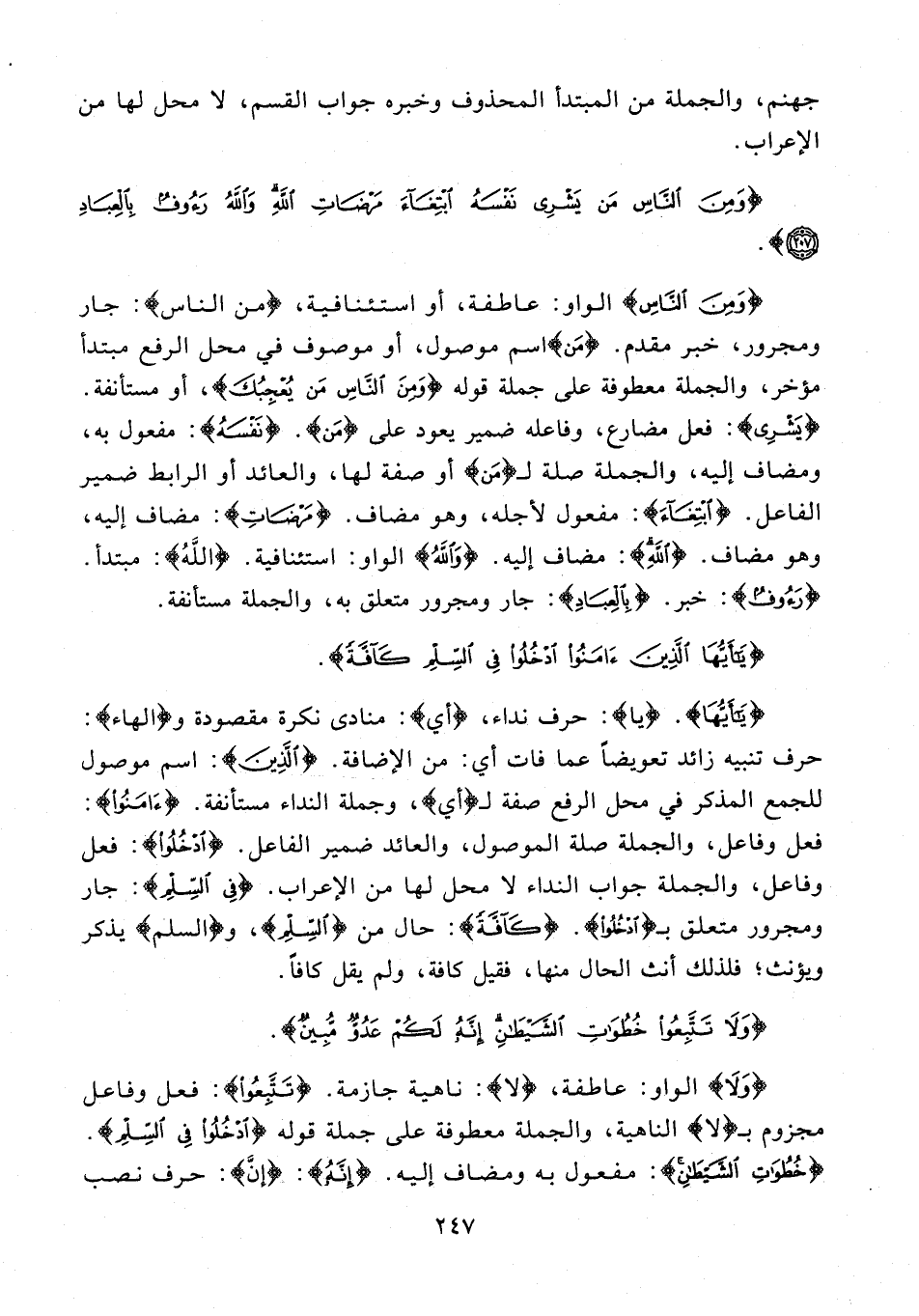 {يَا أَيُّهَا}. {يا}: حرف نداء، {أي}: منادى نكرة مقصودة و {الهاء}: حرف تنبيه زائد تعويضًا عما فات أي: من الإضافة. {الَّذِينَ}: اسم موصول للجمع المذكر في محل الرفع صفة لـ {أي}، وجملة النداء مستأنفة. {آمَنُوا}: فعل وفاعل، والجملة صلة الموصول، والعائد ضمير الفاعل. {ادْخُلُوا}: فعل وفاعل، والجملة جواب النداء لا محل لها من الإعراب. {فِي السِّلْمِ}: جار ومجرور متعلق بـ {ادْخُلُوا}. {كَافَّةً}: حال من {السِّلْمِ}، و {السلم} يذكر ويؤنث؛ فلذلك أنث الحال منها، فقيل كافة، ولم يقل كافًّا.